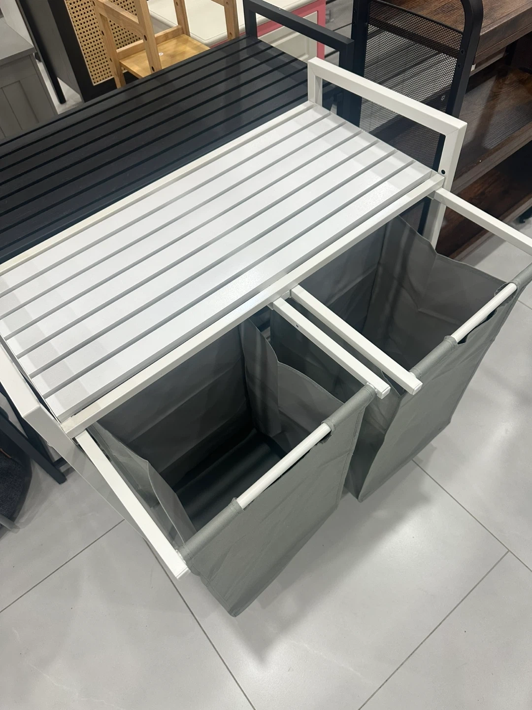 Keep your laundry organized with this double laundry hamper! It features a convenient shelf on top for extra storage. The hamper has two separate compartments for sorting clothes. The colour is grey.