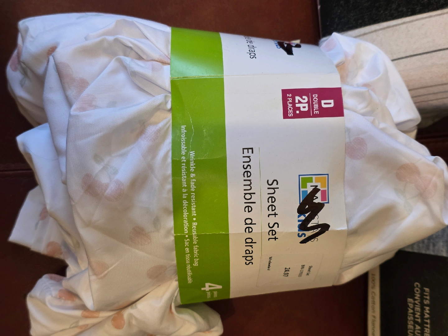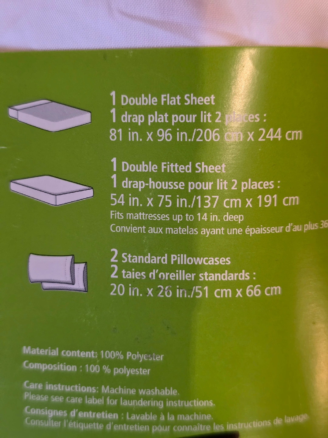 Double sheet set with a cute pink cherry pattern! Includes one double flat sheet (81 in x 96 in/206 cm x 244 cm), one double fitted sheet (54 in x 75 in/137 cm x 191 cm), and two standard pillowcases (20 in x 26 in/51 cm x 66 cm). The material is 100% polyester and is machine washable