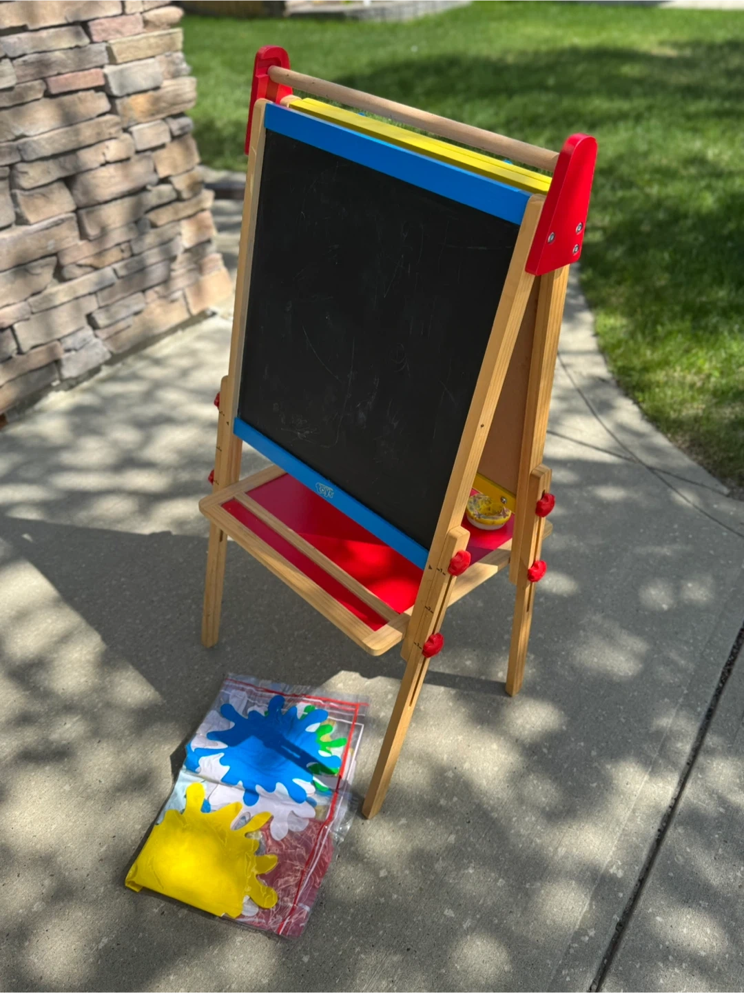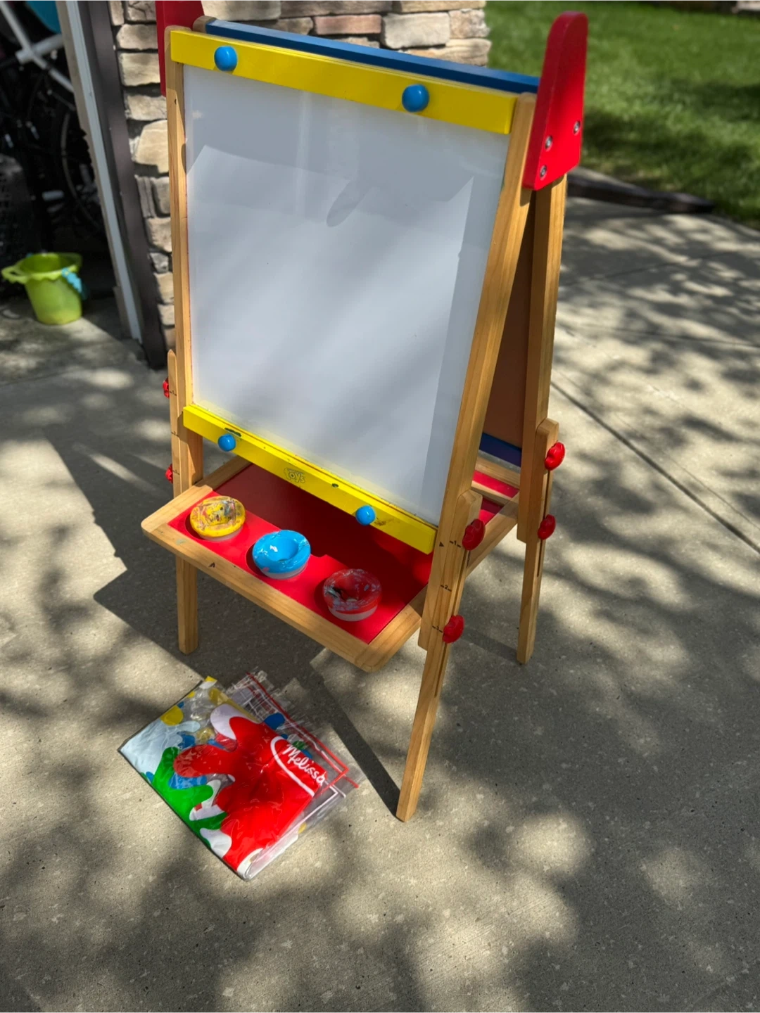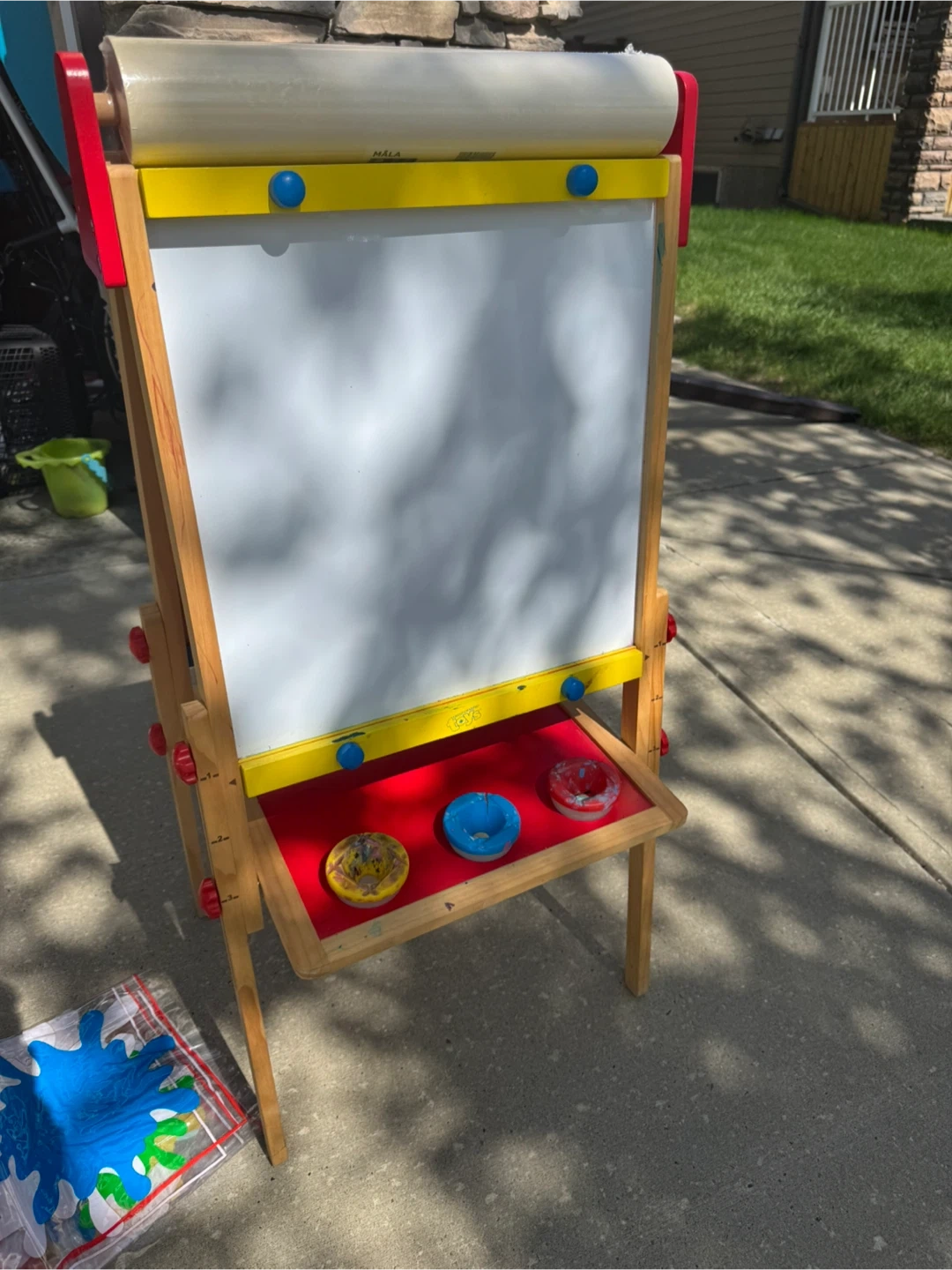 This easle is perfect for your little artist! It's double-sided, so two kids can create at the same time. Comes a brand new roll of paper, paint cups and drop cloth.