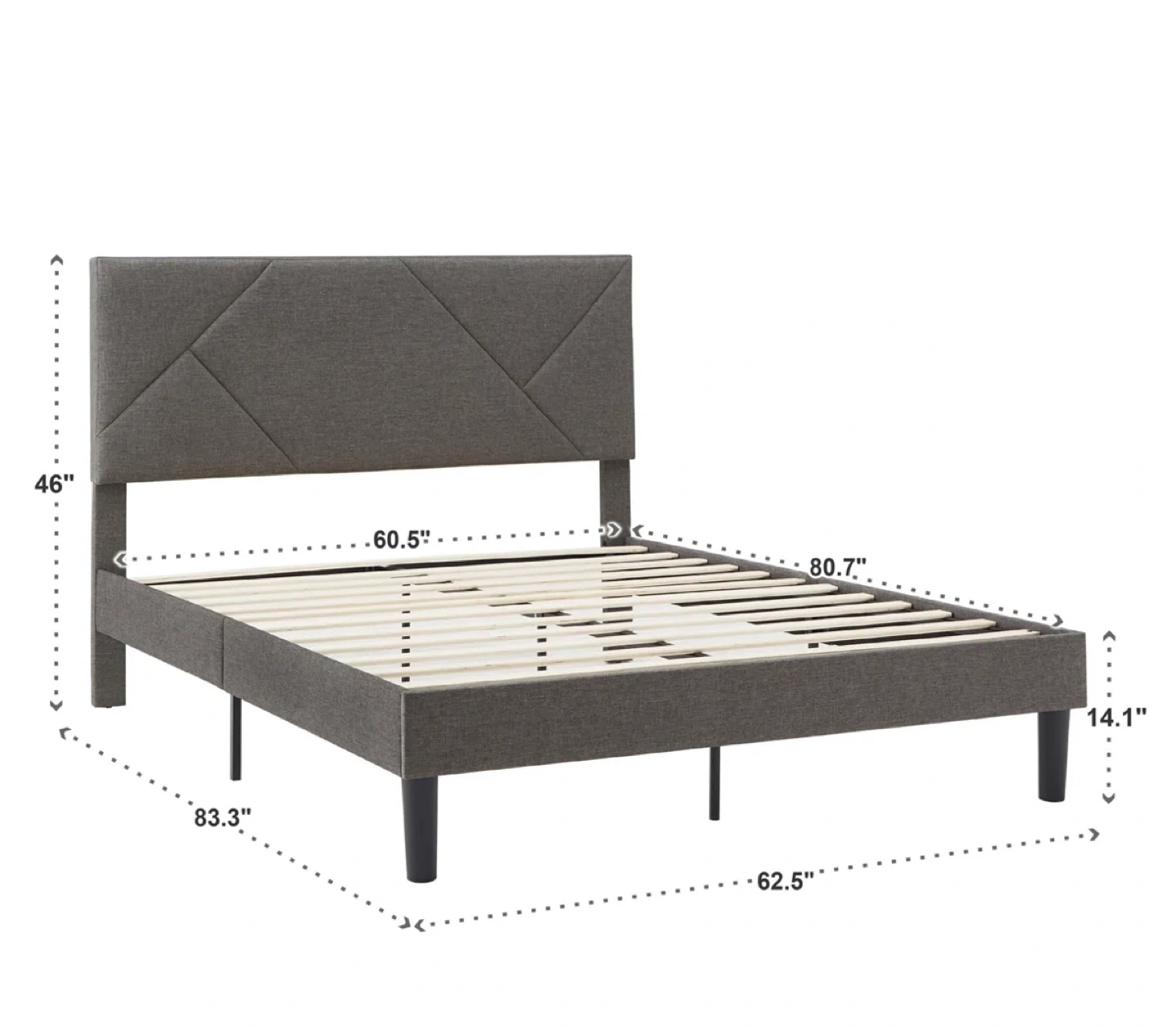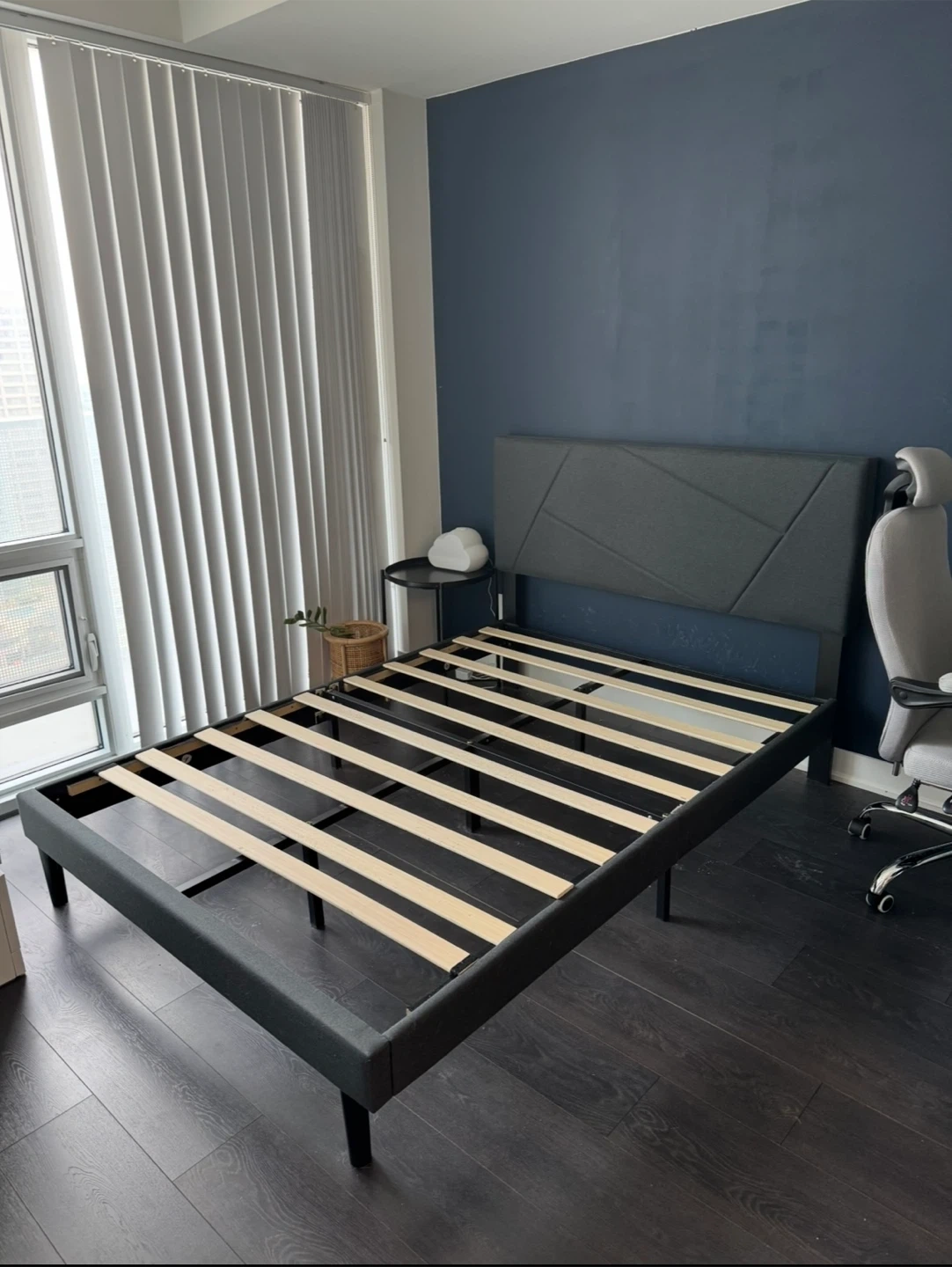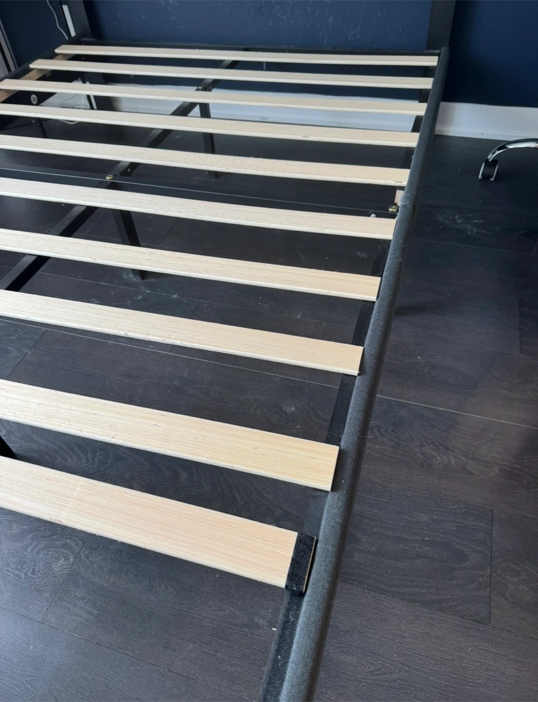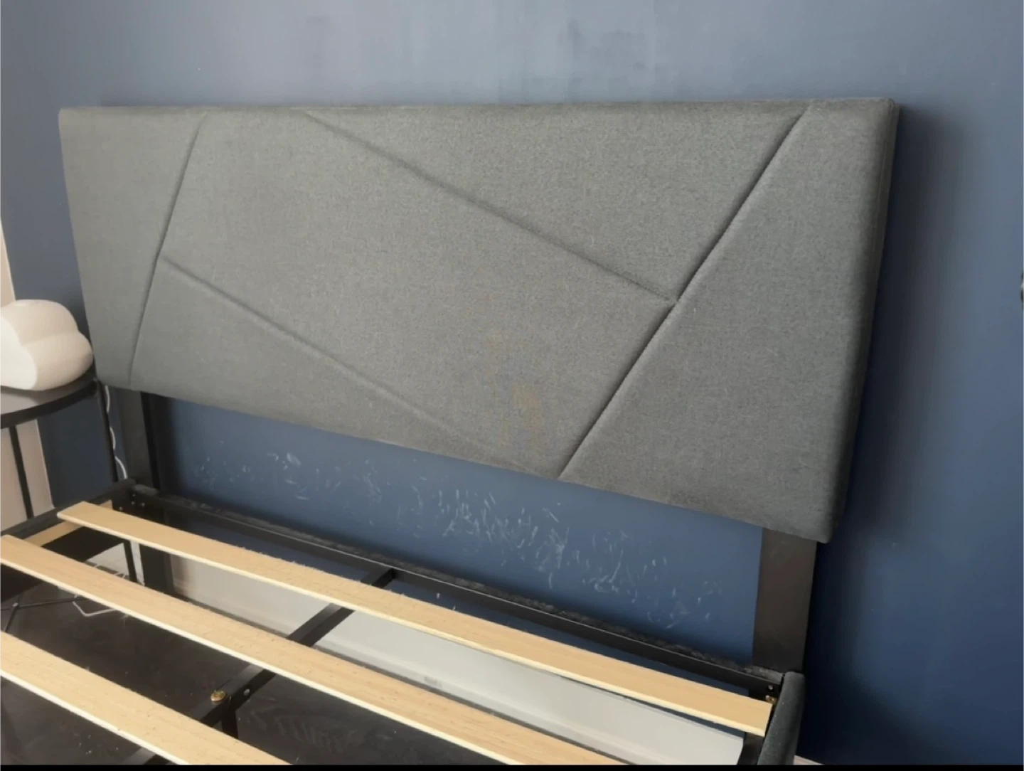 Selling a double size bed frame that was used less than a year. Selling because I got a queen instead. It's in amazing condition, bought for $400 originally. The headboard is fabric and there are no marks or scuffs on it (the discolouring on the 3rd pic is from the camera being weird). It’s very well made and sturdy; soldered together, not just screwed in. The wooden slats are Velcro so they don’t move around at all. Wouldn’t recommend if any pet allergies because my friends would bring their cat over occasionally. It can be disassembled for transport, but still in one piece currently so I’ll need some help with that. Pick up and cash only