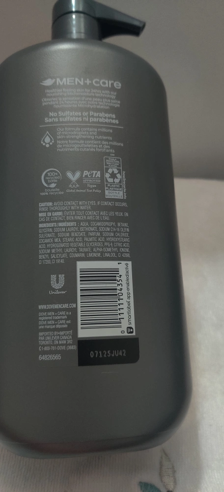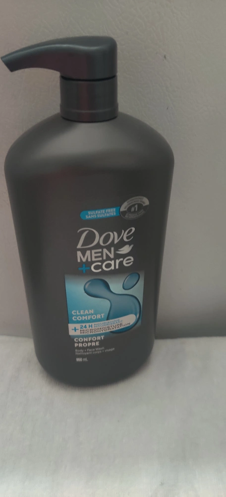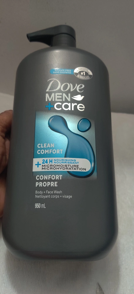 I'm selling a bottle of Dove Men+Care Clean Comfort body and face wash. It's a generous 950mL size, perfect for daily use. This body wash is designed to be nourishing and provides 24-hour moisturization. It's also sulfate-free, which is great for sensitive skin