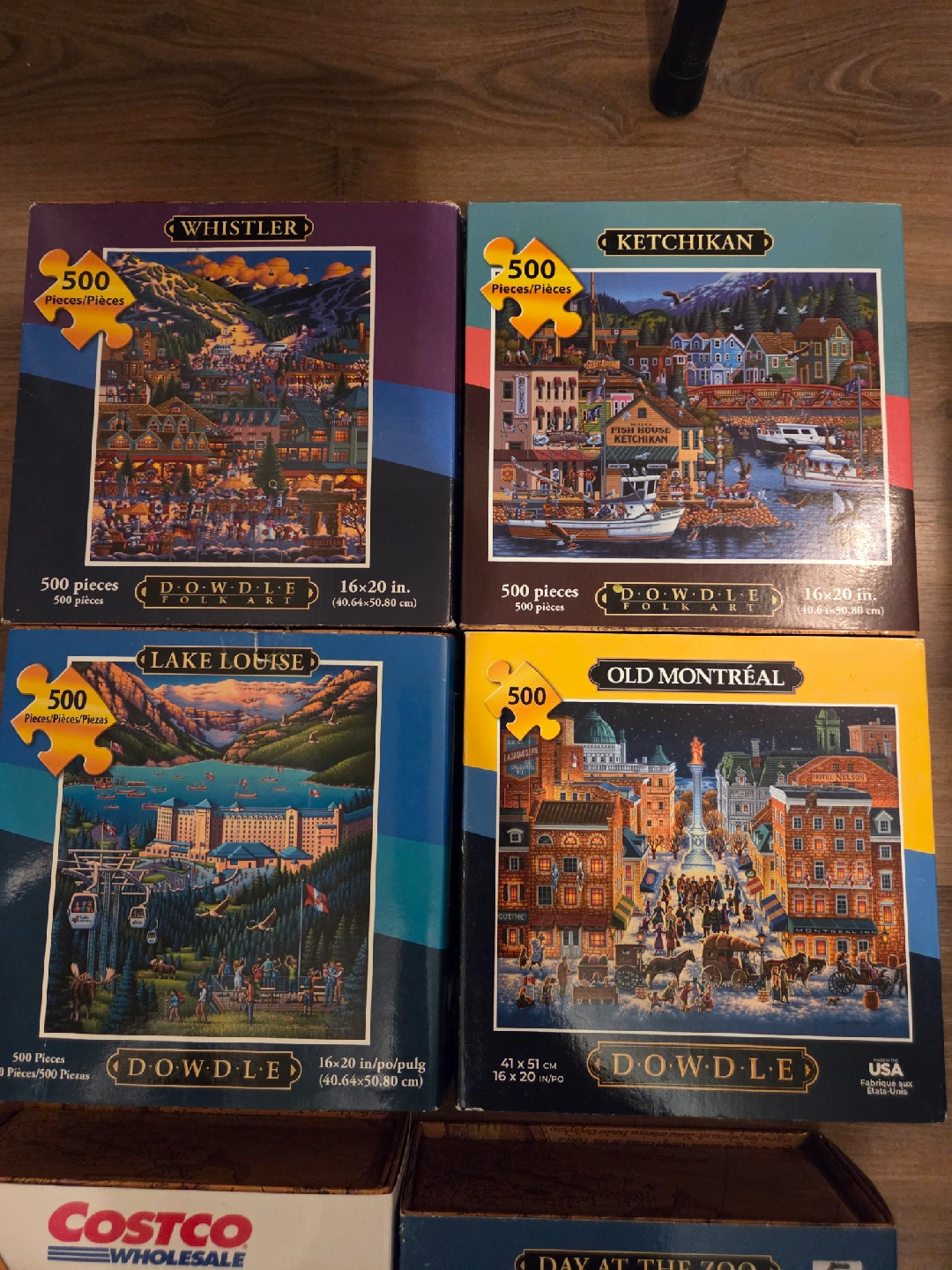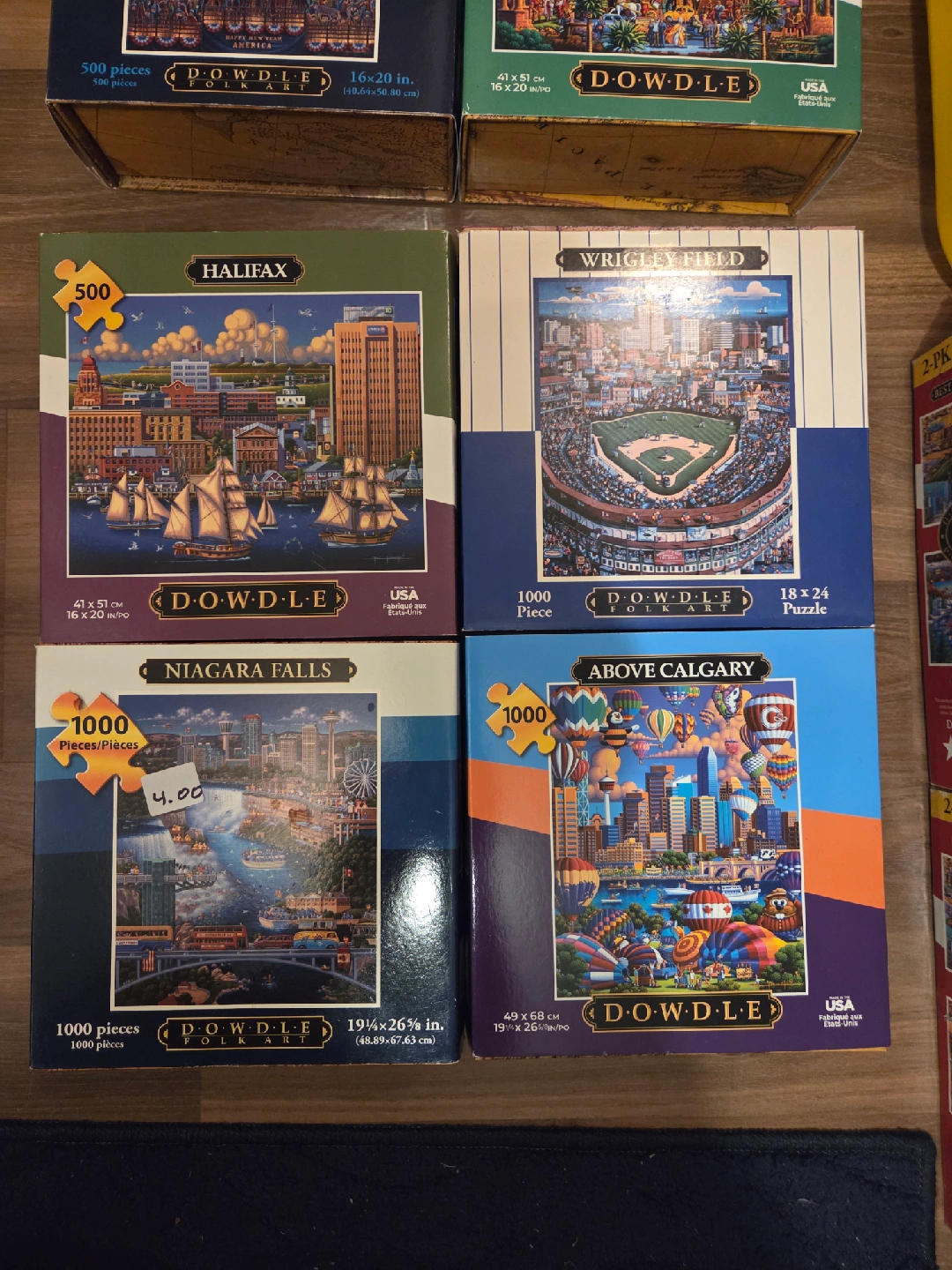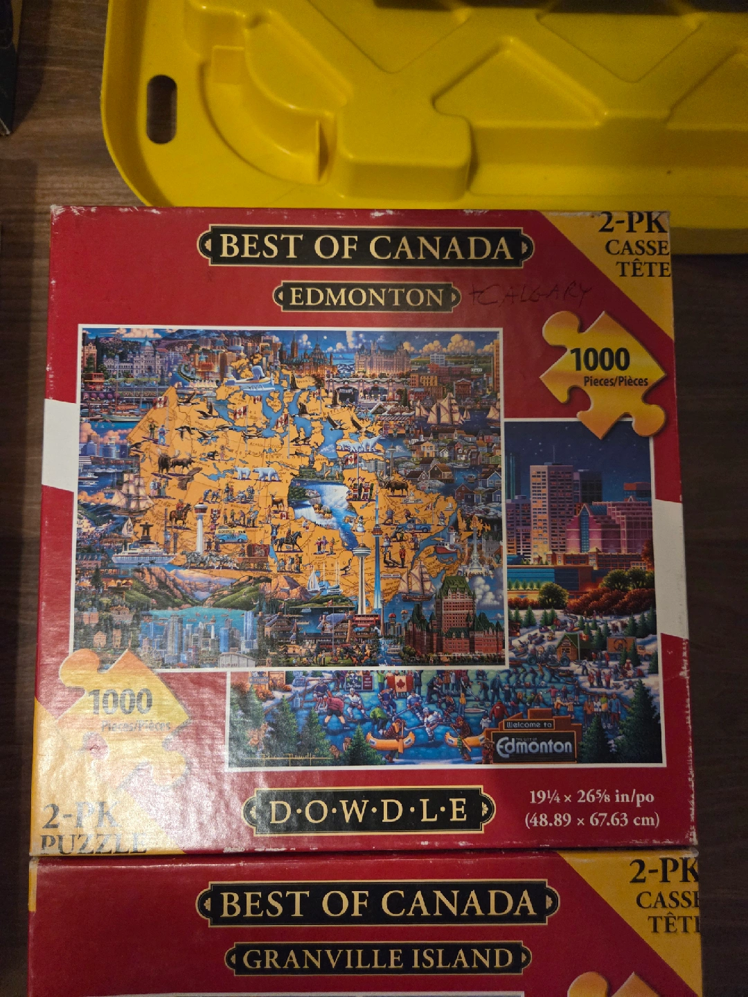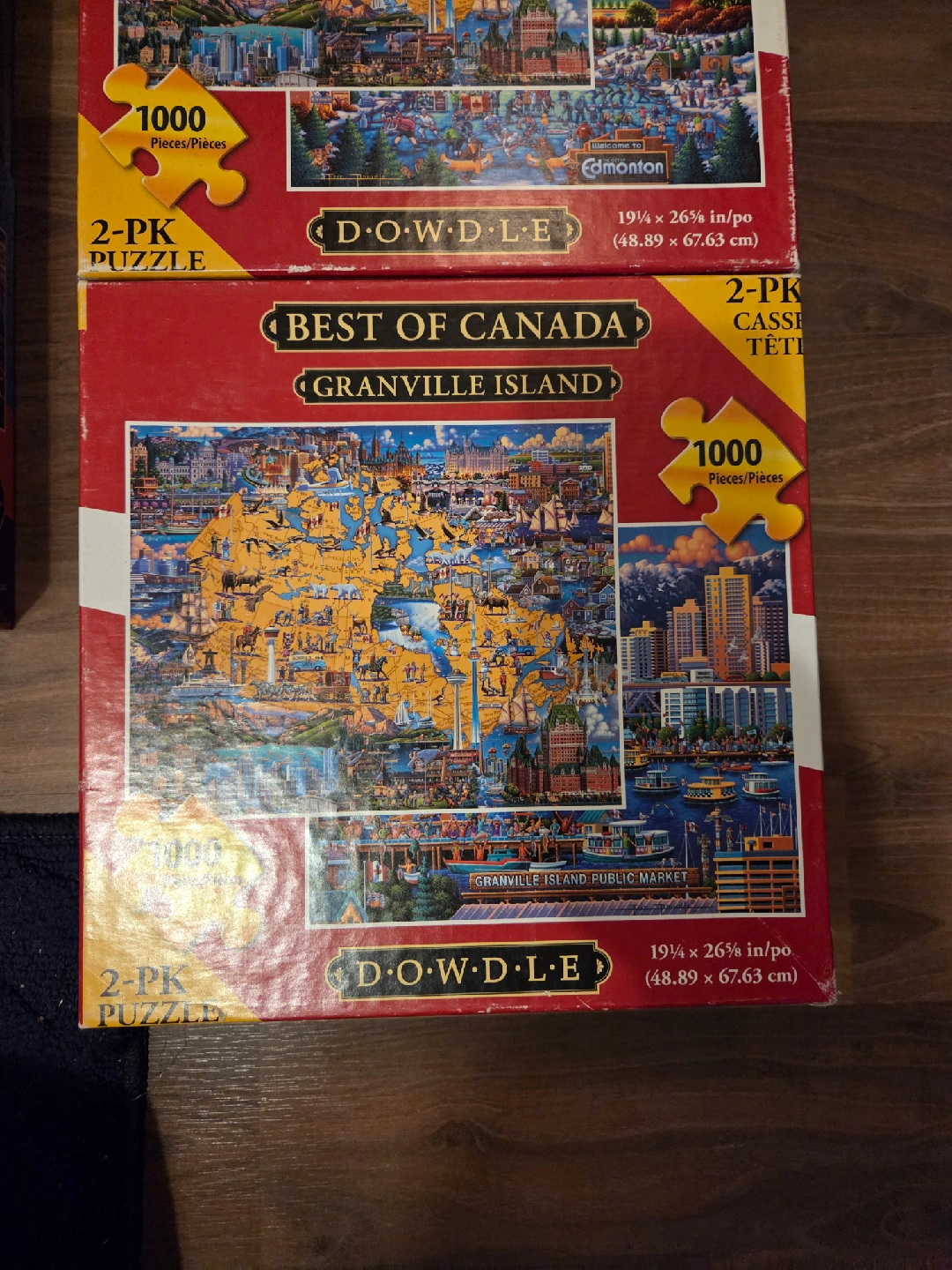 Selling a Dowdle puzzle set This set includes two 1000-piece puzzles: one of Edmonton/Calgary and one of Granville Island. Each puzzle measures 19 1/4 x 26 1/4 inches (48.89 x 67.63 cm). Enjoy piecing together these beautiful Canadian scenes!
