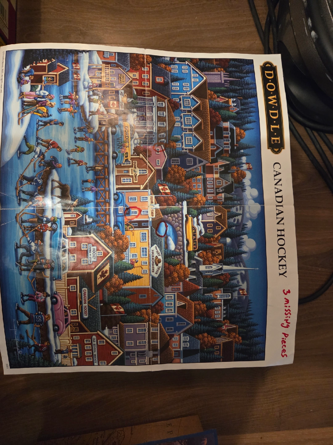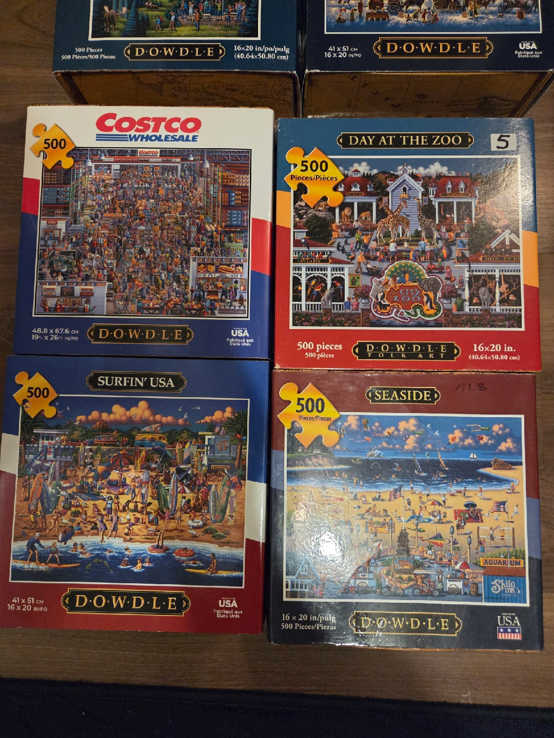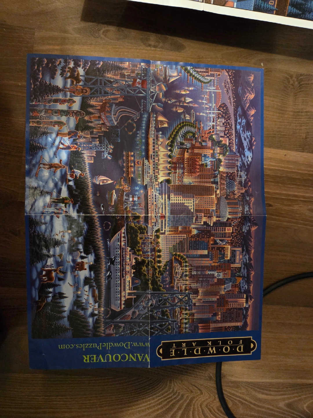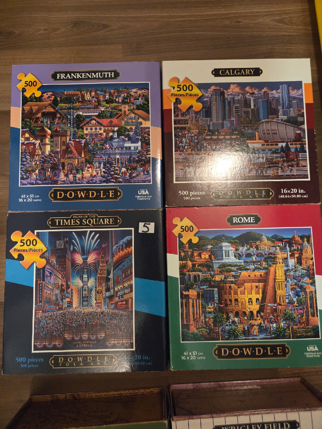 Selling a Dowdle puzzle set This set includes two 1000-piece puzzles: one of Edmonton/Calgary and one of Granville Island. Each puzzle measures 19 1/4 x 26 1/4 inches (48.89 x 67.63 cm). Enjoy piecing together these beautiful Canadian scenes!
