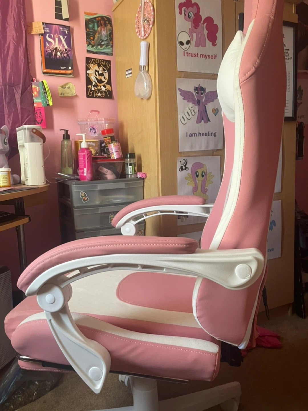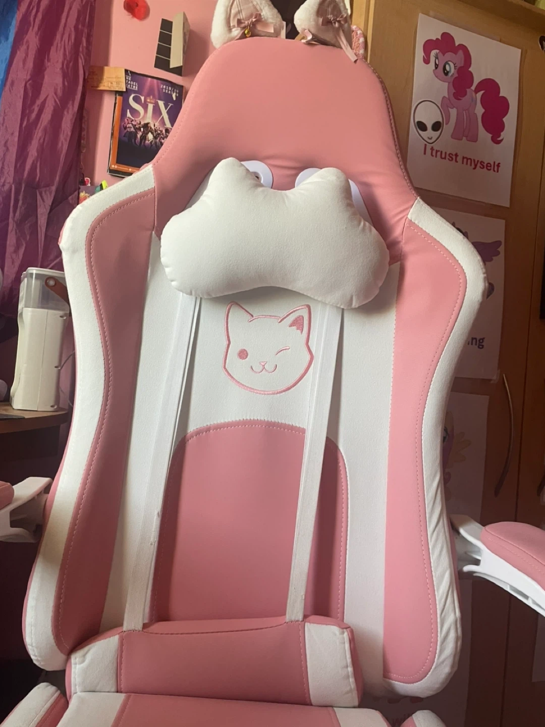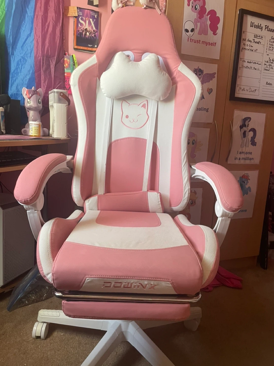 Looking to sell my Dowinx gaming chair. It's in great condition and super comfy for long gaming sessions or working from home! The chair is pink and white, adding a cute touch to any setup. It also has a cat design on the headrest! Need to sell because I am moving, otherwise perfectly fine chair.