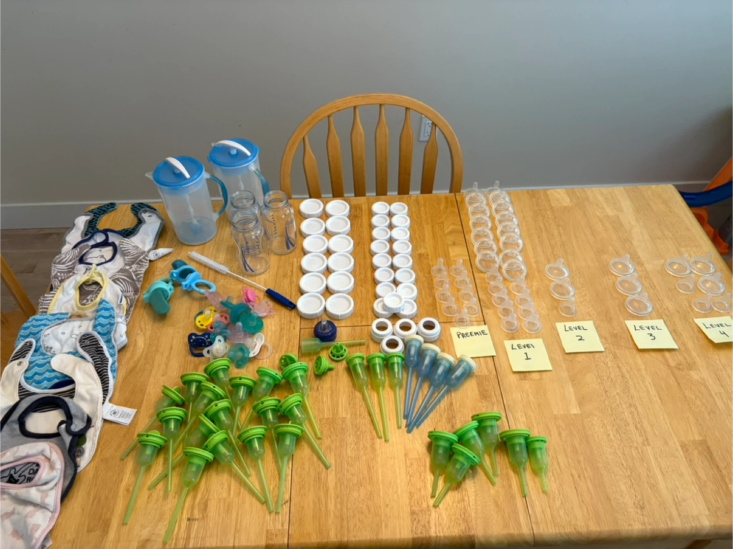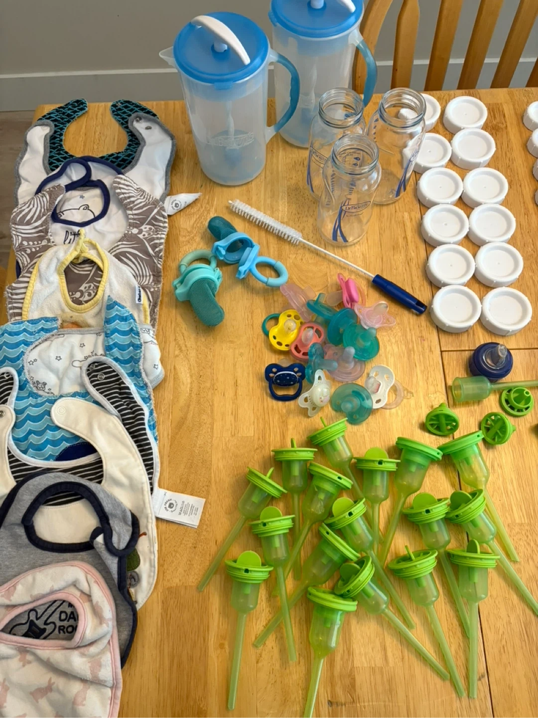 Selling a large assortment of Dr. Brown's baby bottles and accessories! This includes bottles, lids, nipples in various sizes (preemie, level 1, level 2, level 3, level 4), bibs, and cleaning brush. Everything you need for feeding your little one! HAND WASHED ONLY!