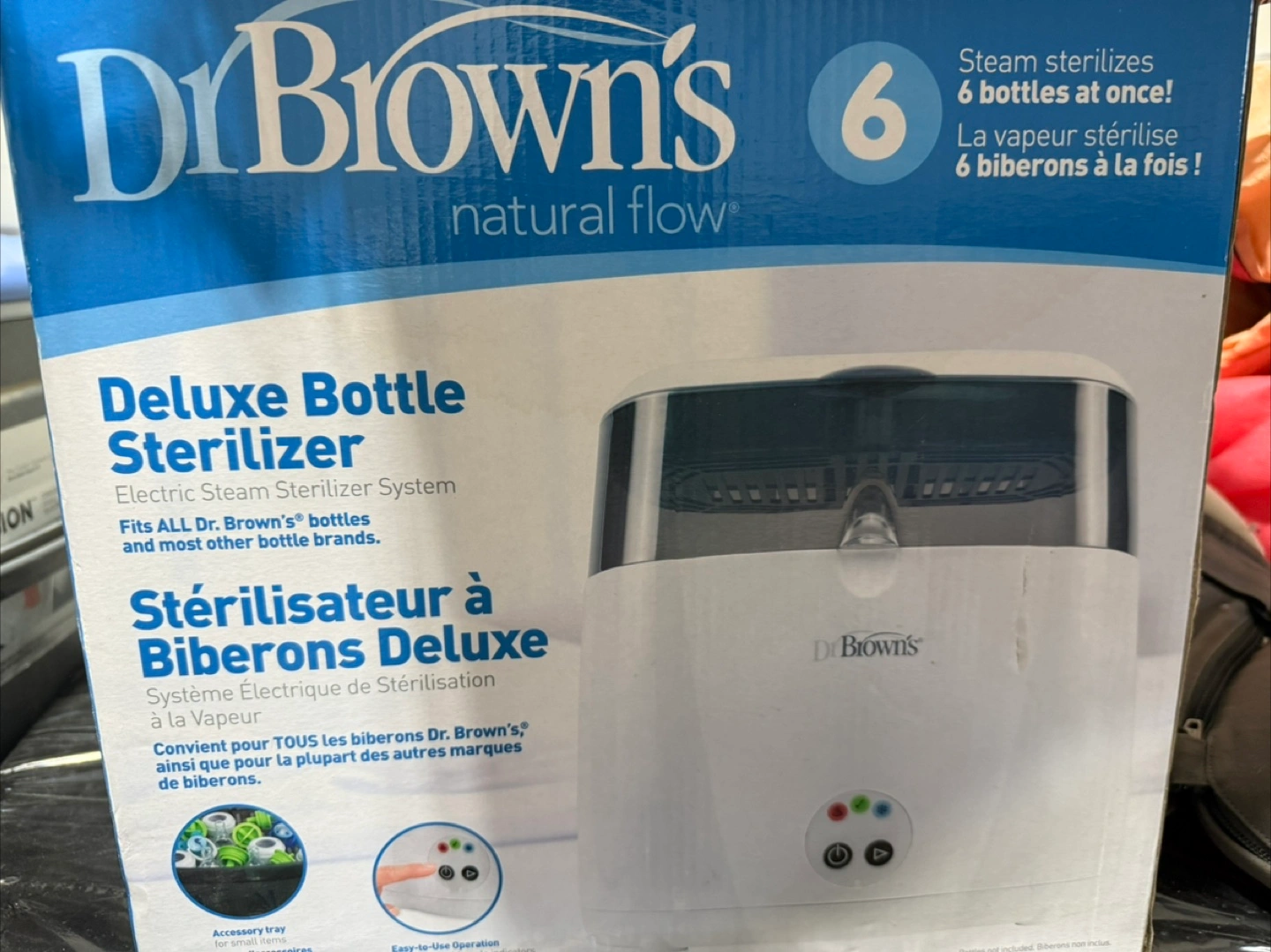 Steam sterilizes six bottles at once. Electric system. Fits Dr Brown's and most other brands.