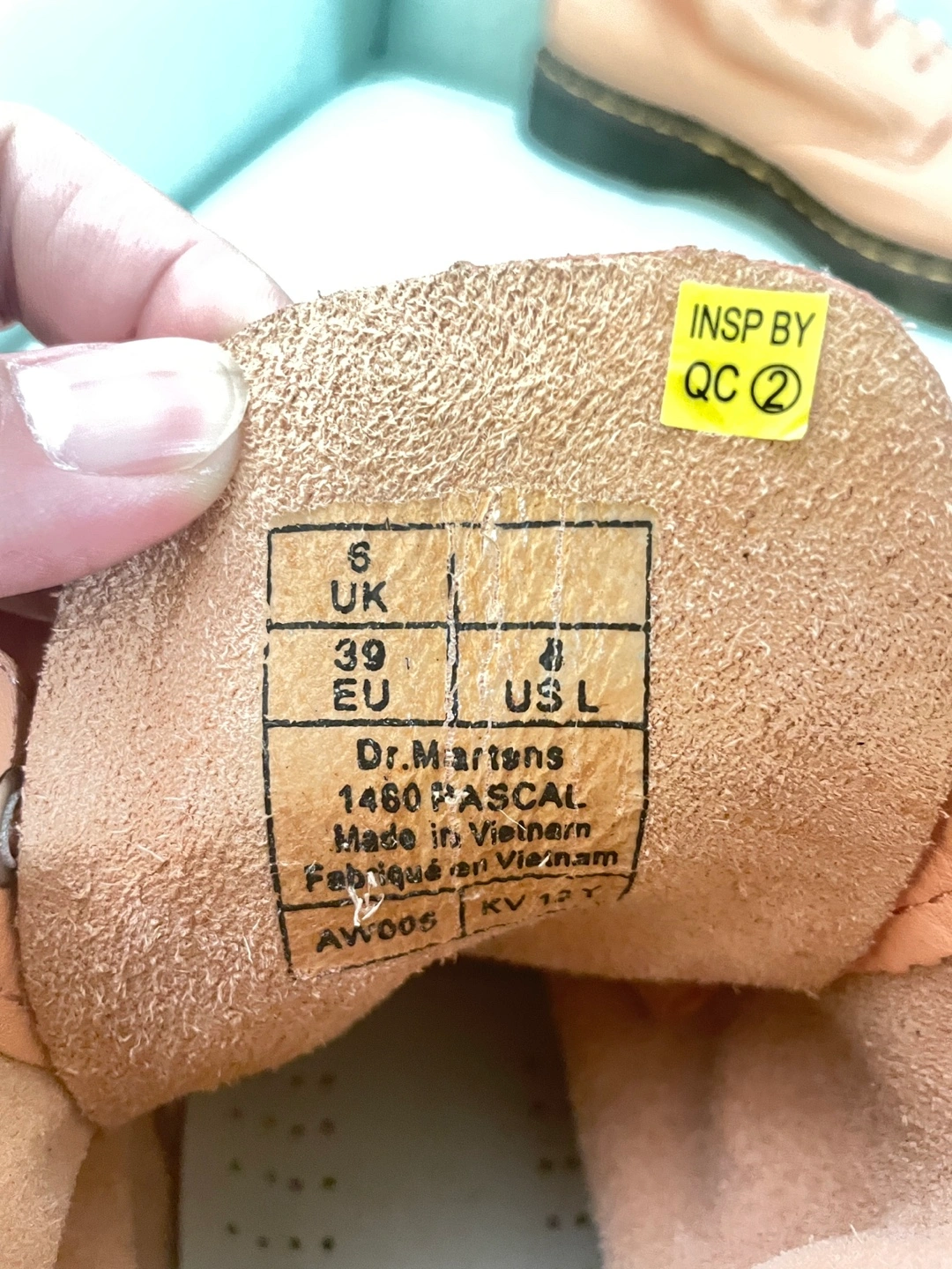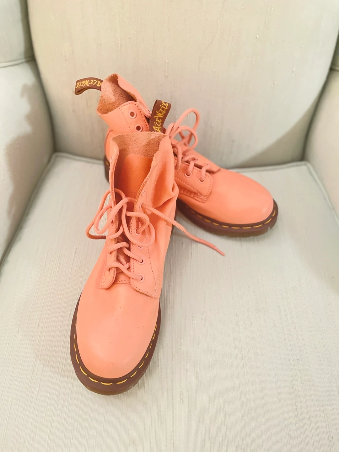 Pre-owned Dr. Martens 1460 Pascal boots. Coral coloured leather. Size: UK 6, EU 39. Made in Vietnam. Lace-up style.