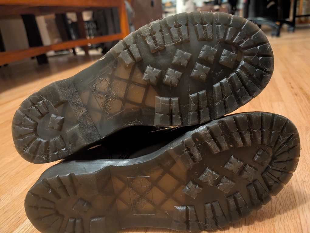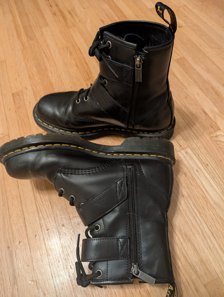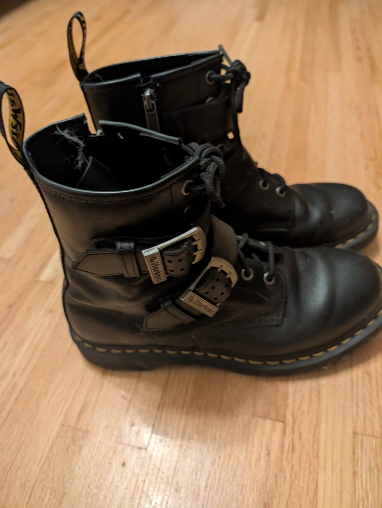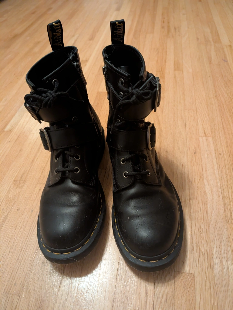 Selling a pair of Dr. Martens boots in black leather. They are a US size 10, UK size 8, and EU size 42. These boots have a buckle design with a side zipper and are in good condition. Perfect for adding a bit of edge to your style! Worn a few times, selling as I just don't wear these often enough. From a NS, dog friendly home.