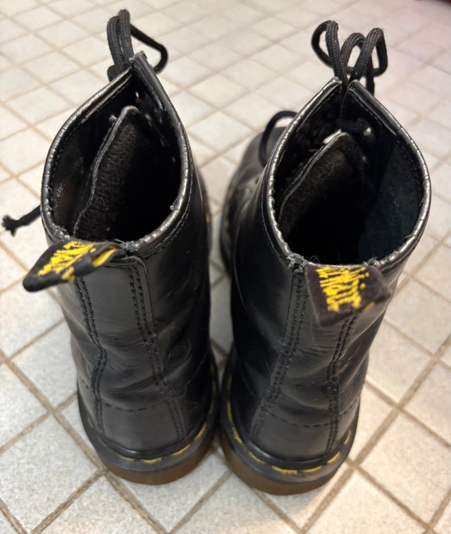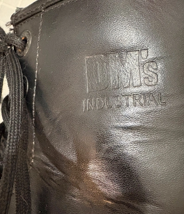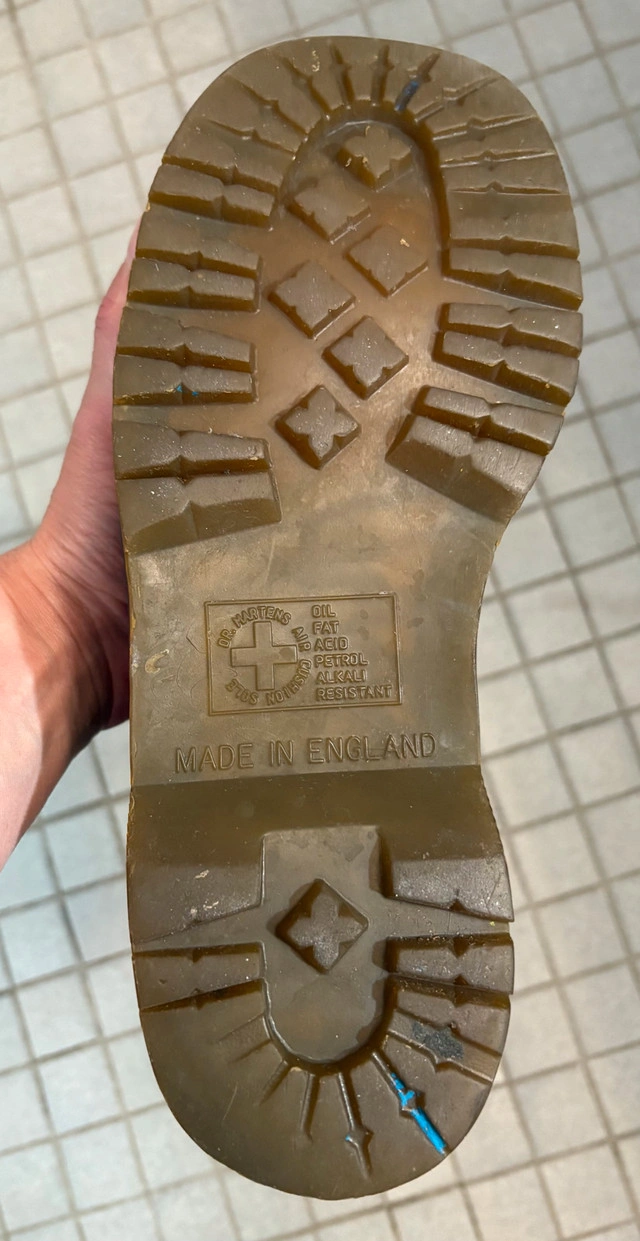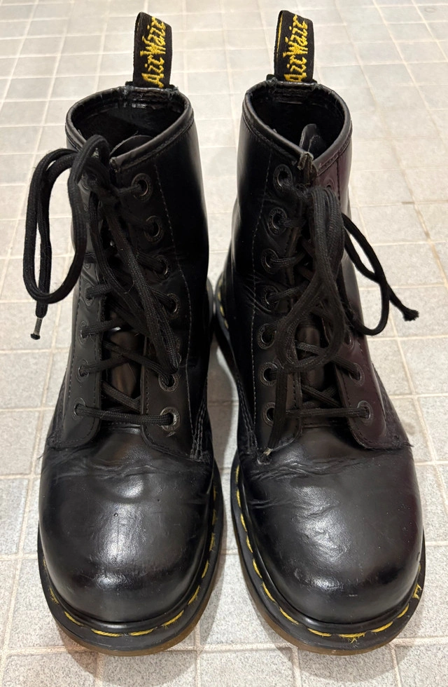Good Used Condition. Vintage. Made in England. Some scuffs on the leather, but otherwise good condition. I have fully cleaned and conditioned the leather using Dr. Marten brand products. The laces are worn, but are clean (I washed them separately). Black. Size 5UK/7US Women’s. Steel-Toed Industrial Style.