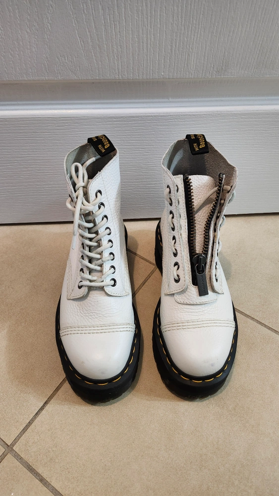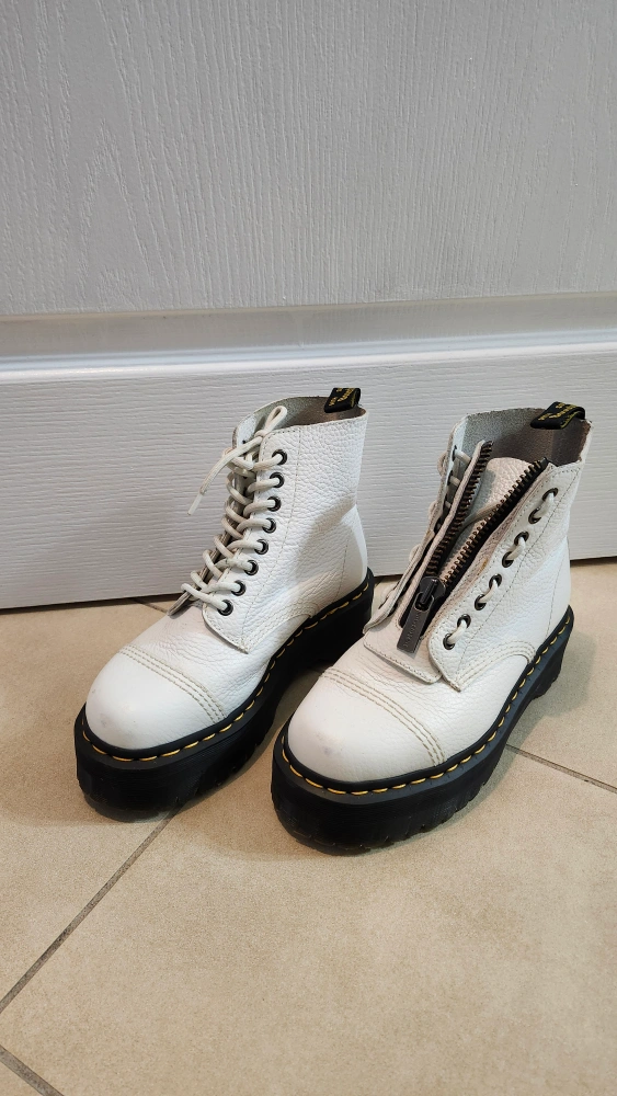 Women's white nappa leather Dr. Martens Sinclair platform boots. Side zip for easy on and off. Lace-up style. Thick platform sole. I wore them about 4 times, always inside the house to try them out. They were $280 new. Size US7 / EU8/ UK5