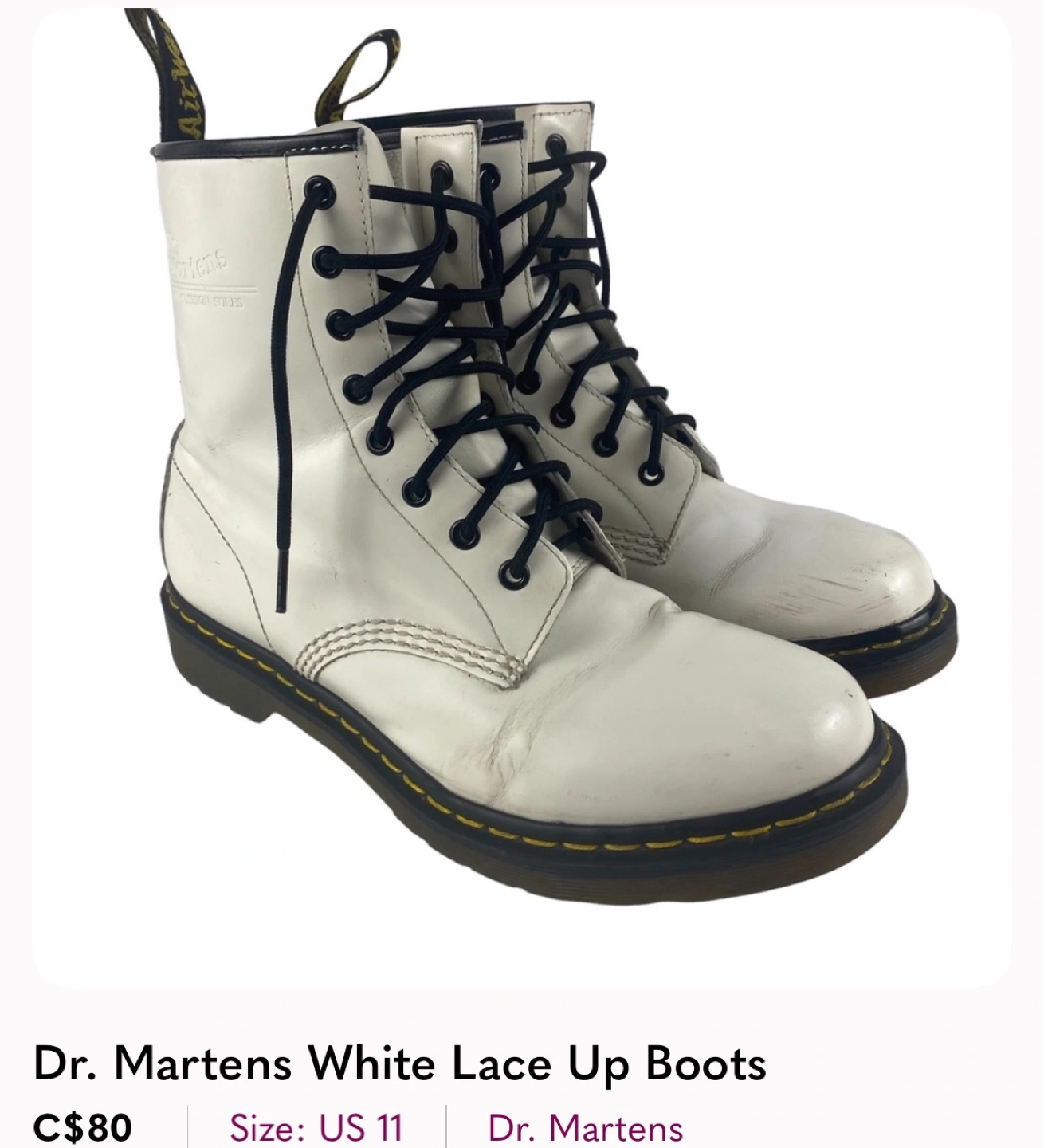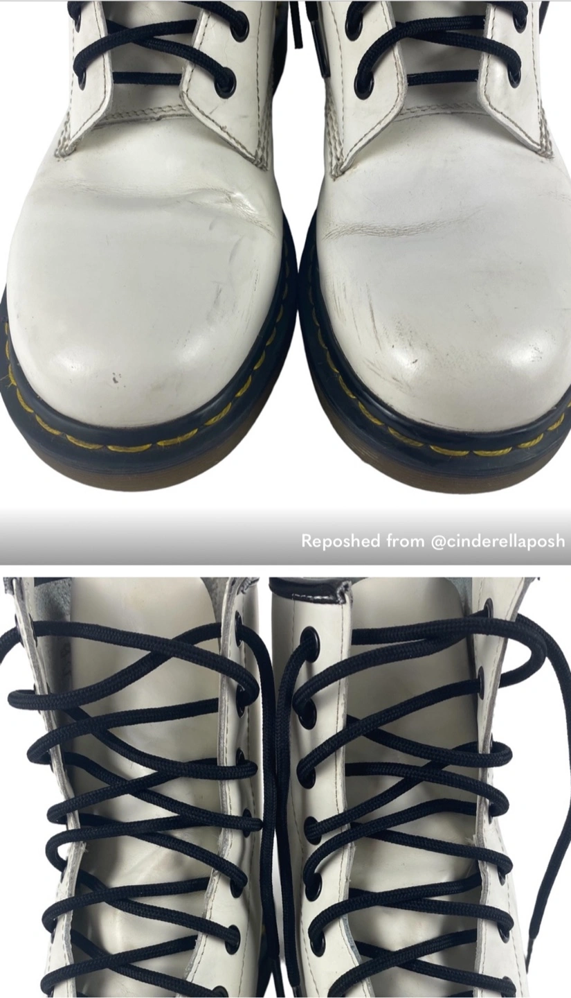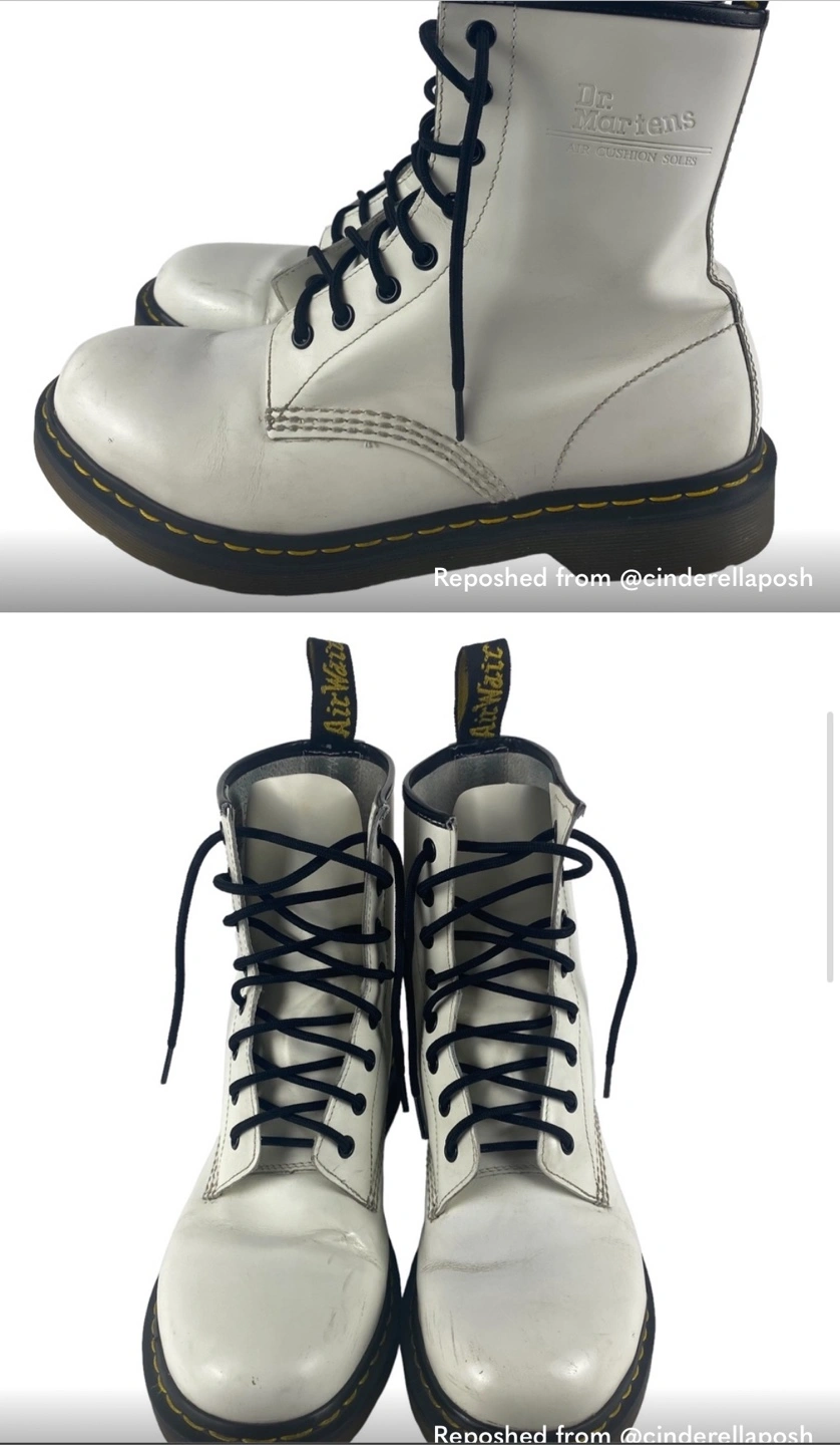 White leather Dr. Martens boots. Lace-up style. Size US 11. Women’s. Pre-owned. I got these off of Poshmark and they didn’t fit :(