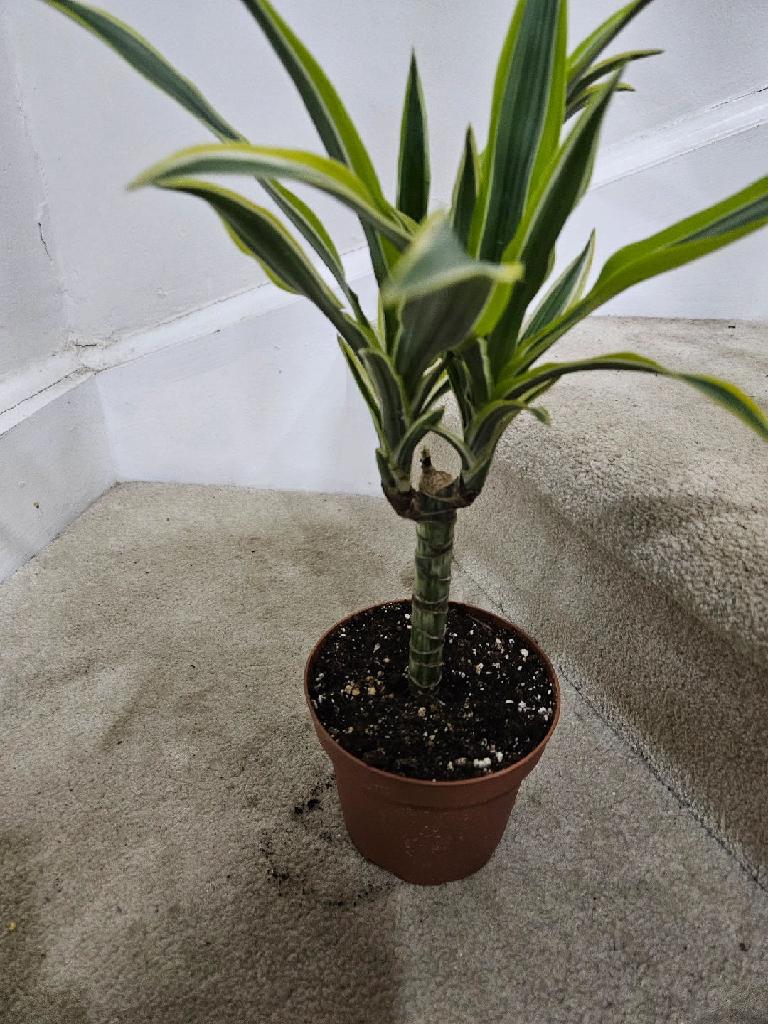 Selling a Dracaena plant in a brown plastic pot. It's a lovely addition to any home or office space! It's quite healthy and ready to thrive in its new home