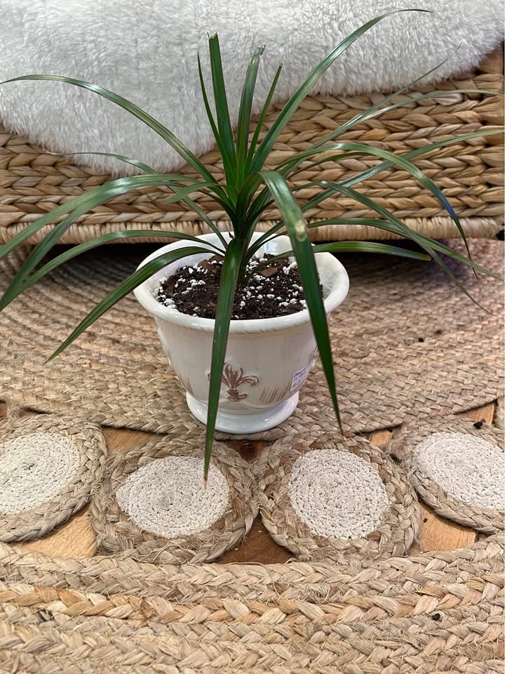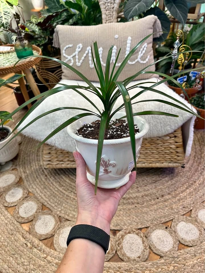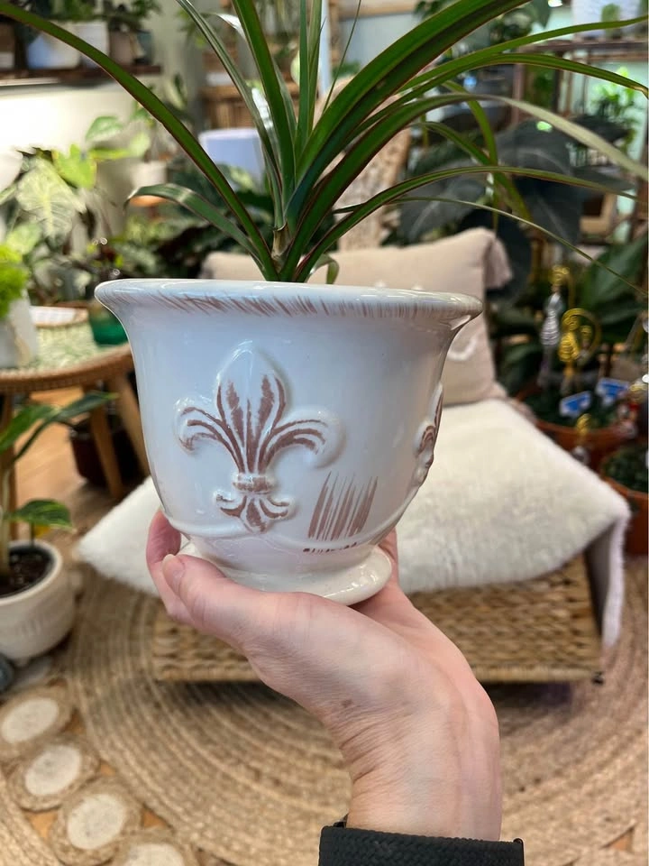 Draceana Reflexa in a vintage Fleurs De Lis pot with added drainage. Pick up at The Plant Witch in Erin Ridge, St.Albert Check out my other listings or go to my website theplantwitch.ca to view all my listings for different potted plant varieties, suncatchers, propagation jars, decorative pot stakes and more! 🪴🌞