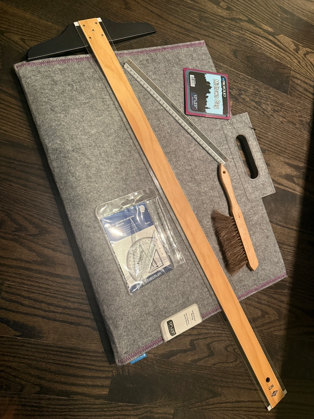 Geometry set includes protractor, ruler, and other drafting tools. Wooden straight edge included. Grey felt carrying case. New, never used.