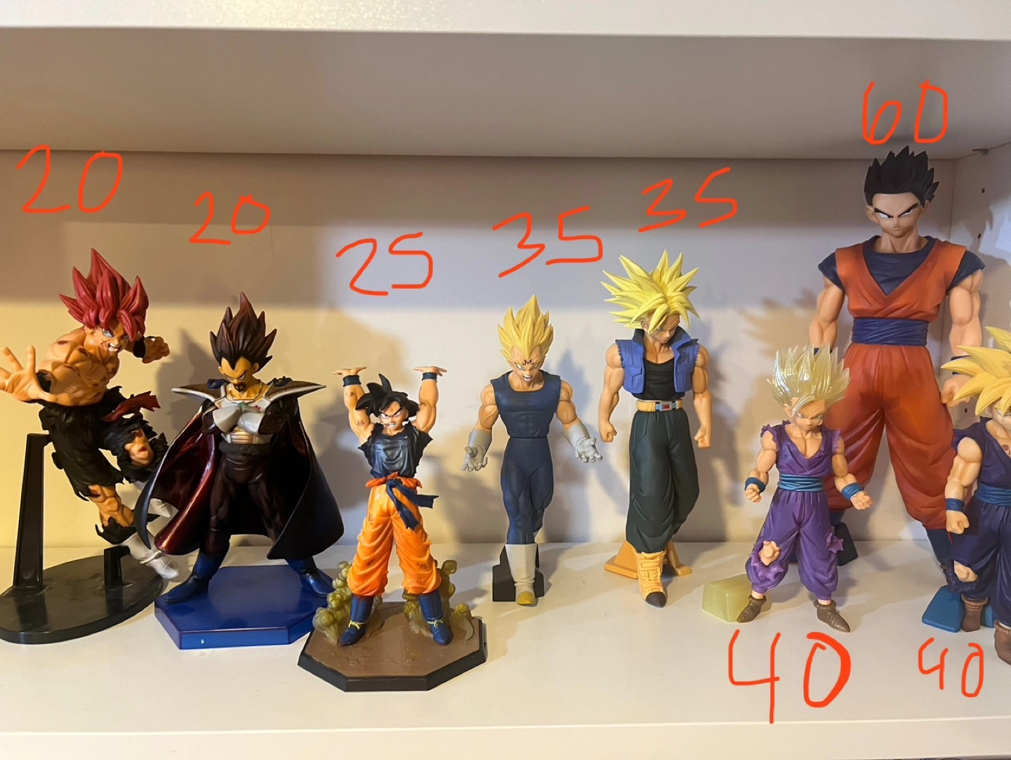 Set of Dragon Ball Z figures. Various characters included. Collectible figurines. Excellent condition. Price is firm for each. Will only do bundle price if buying more than a few. The three on the left are unofficial. Ssj god goku black - $20 (unofficial) King Vegeta -$20. (Unofficial) Spirit bomb goku - $25 (unofficial) The 5 on the right are all official Majin vegeta - $35 Ssj trunks - $35 Ssj2 gohan -$40 Ssj1 gohan - $40 Large ulitimate gohan $60 I can check if I have the box for the one you want. Cash only unless buying large bulk. Near 401 and whites road Pickering Clean and smoke free home.