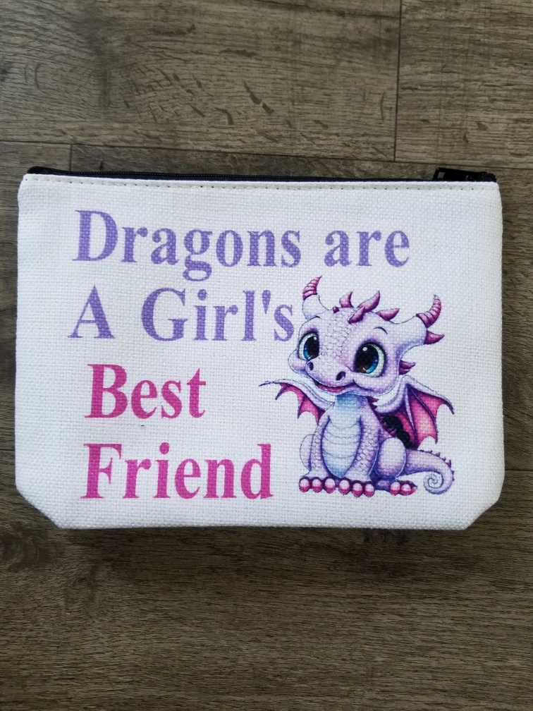 Super cute zipper pouch with a dragon design! The pouch features the text "Dragons are A Girl's Best Friend" along with an adorable little dragon illustration. Perfect for storing small items or cosmetics. Brand new