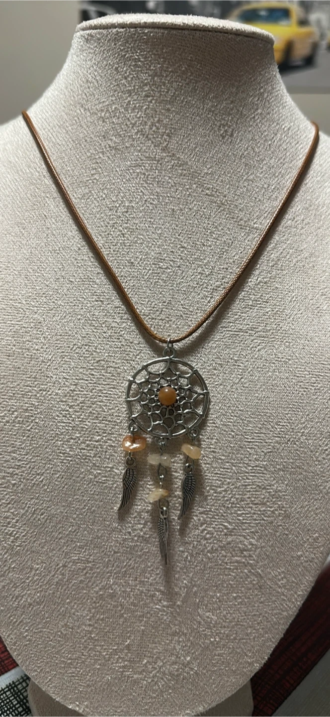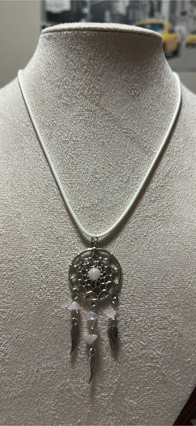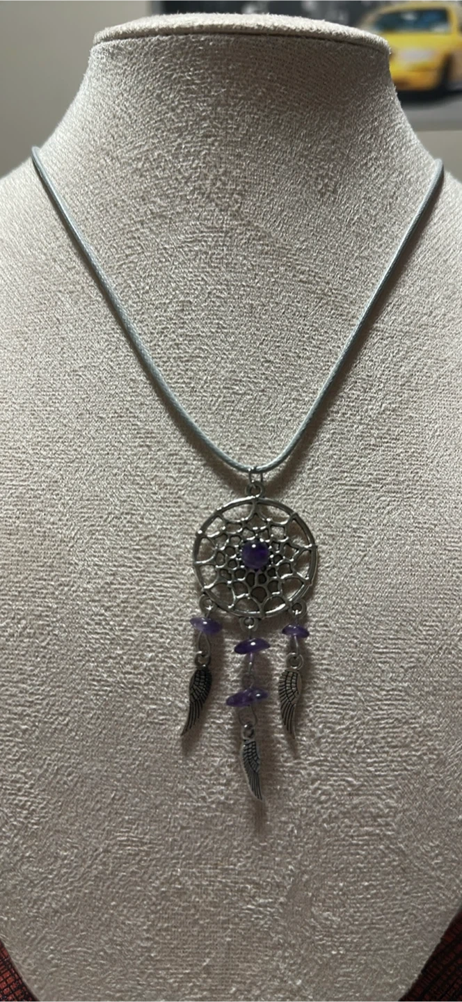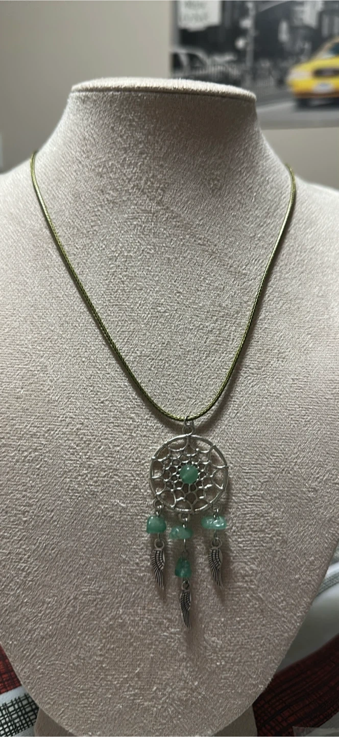I have a selection of dreamcatcher necklaces available! They come in a variety of colours - green, brown, blue, purple, and white. Each necklace features a silver dreamcatcher pendant with matching coloured beads and small wing charms. Perfect for adding a touch of whimsy to any outfit $12.00 each