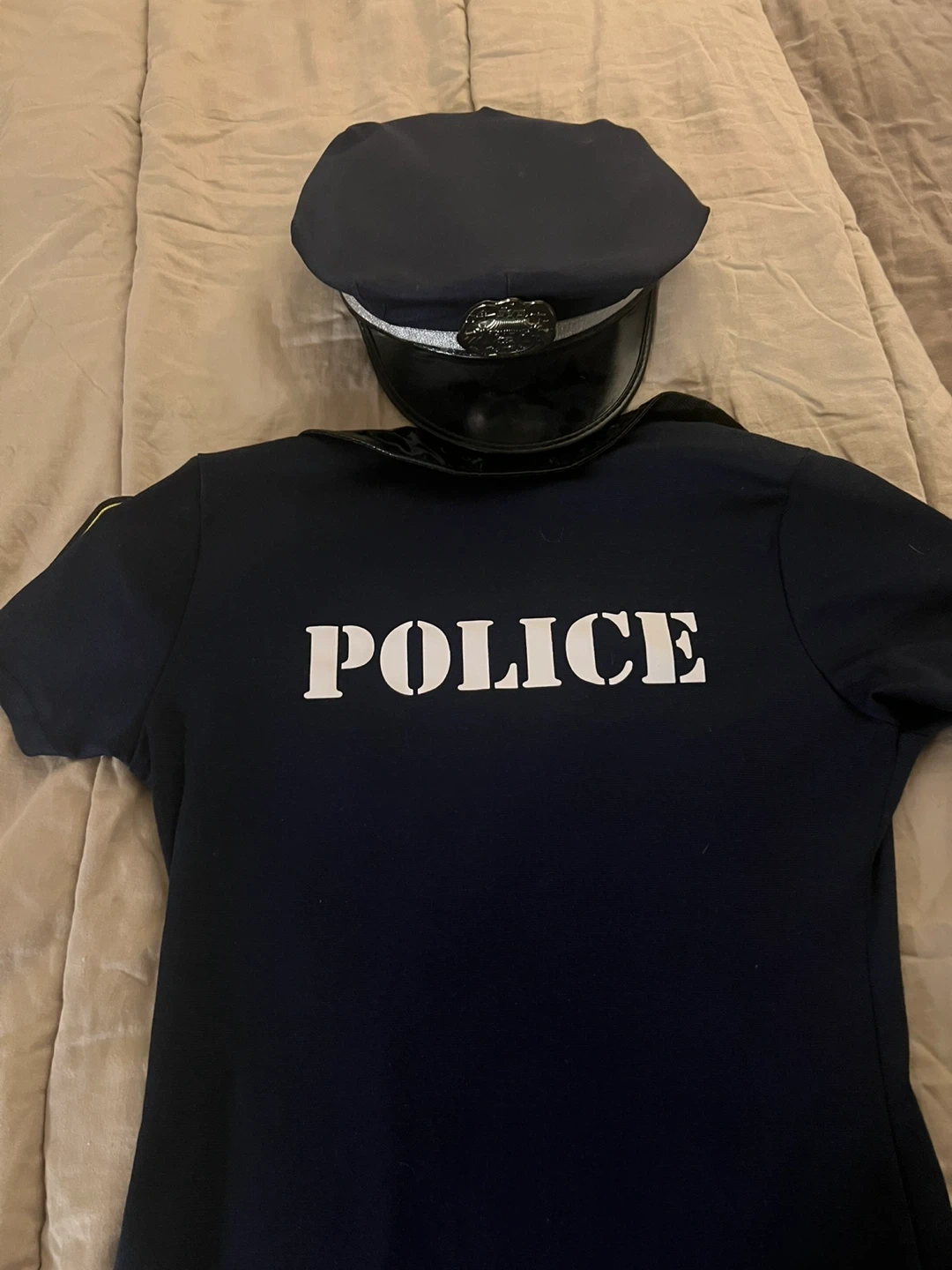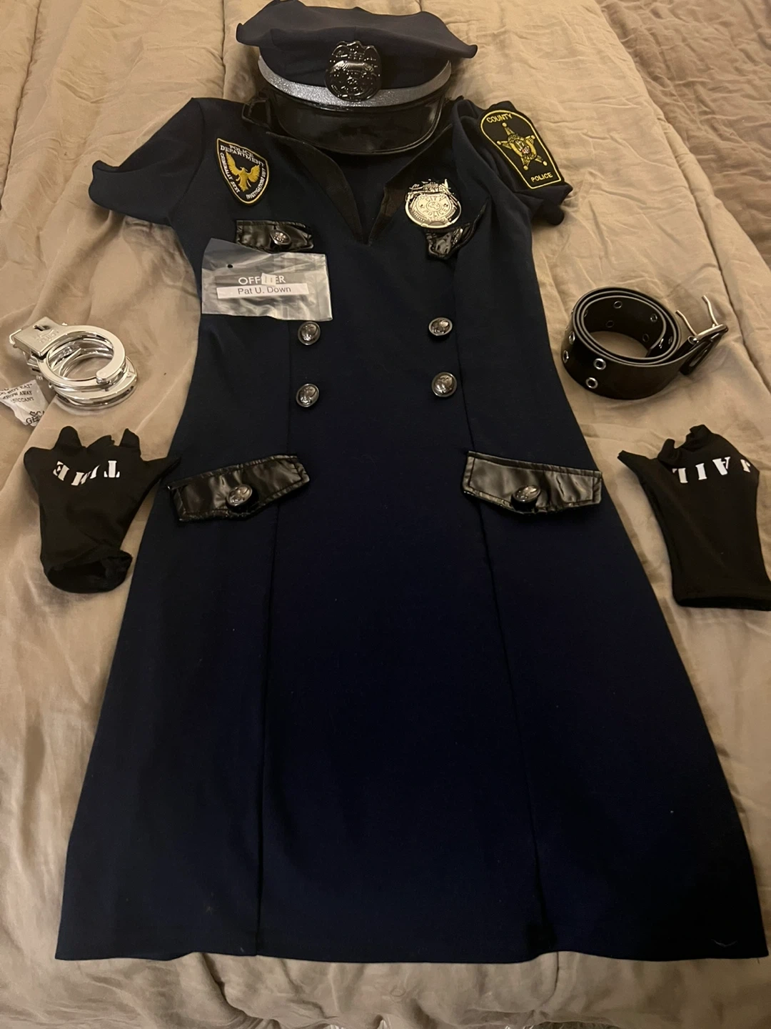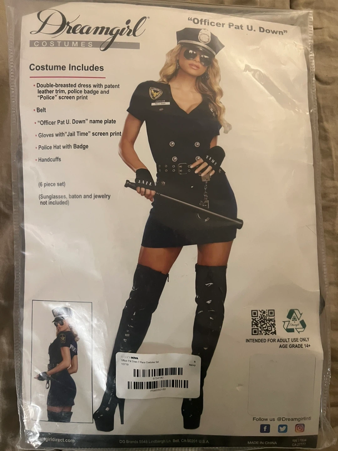 Selling a Dreamgirl "Officer Pat U. Down" costume in size medium! This 6-piece set includes: - Double-breasted dress with patent leather trim and "Police" screen print - Belt - "Officer Pat U. Down" name plate - Gloves with "Jail Time" screen print - Police Hat with Badge - Handcuffs Originally bought for $84.99!u