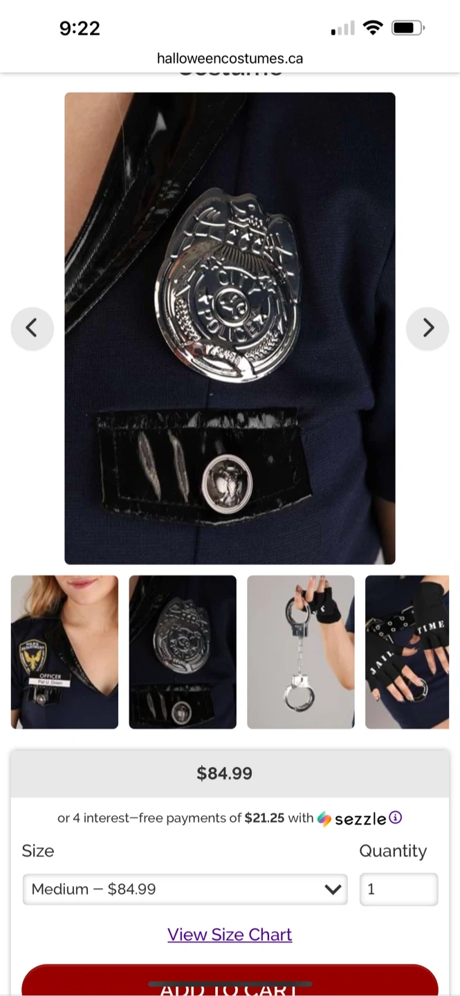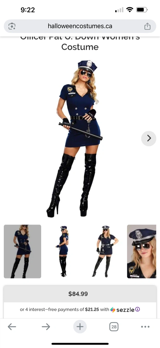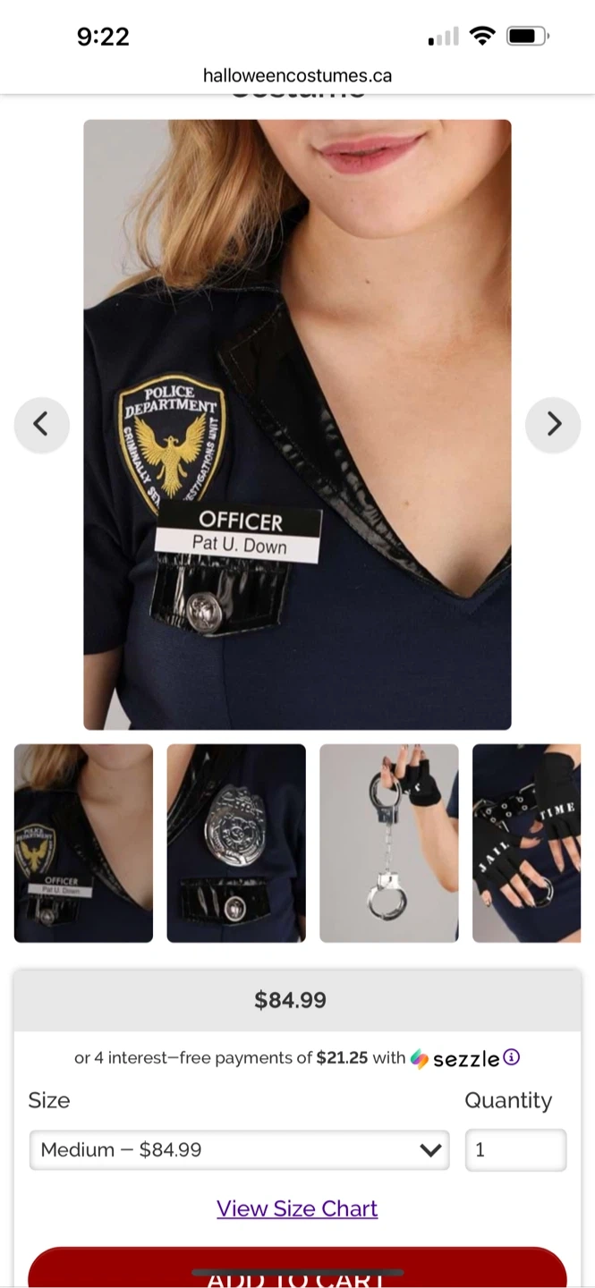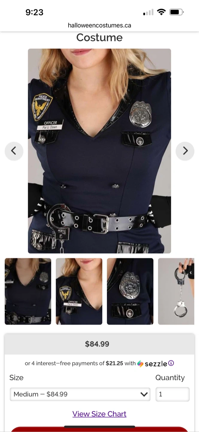 Selling a Dreamgirl "Officer Pat U. Down" costume in size medium! This 6-piece set includes: - Double-breasted dress with patent leather trim and "Police" screen print - Belt - "Officer Pat U. Down" name plate - Gloves with "Jail Time" screen print - Police Hat with Badge - Handcuffs Originally bought for $84.99!u