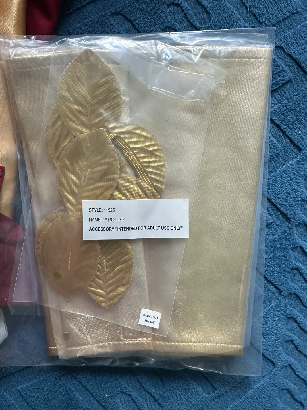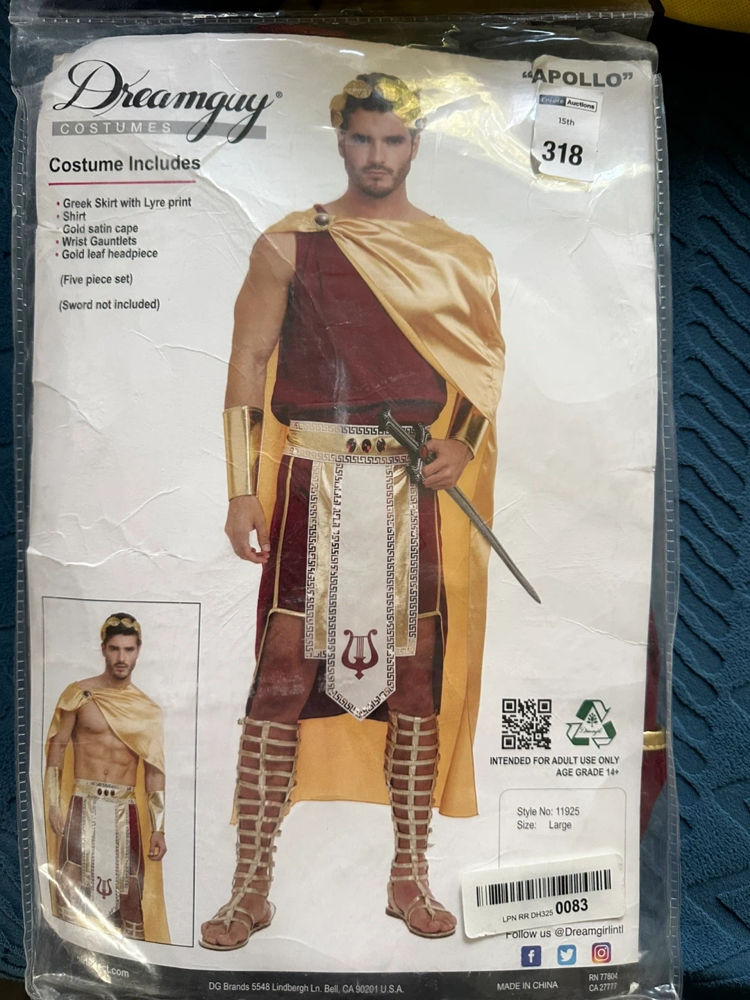 Selling a Dreamguy Apollo costume in size large. The costume includes: - Greek skirt with lyre print - Shirt - Gold satin cape - Wrist gauntlets - Gold leaf headpiece (Sword not included)
