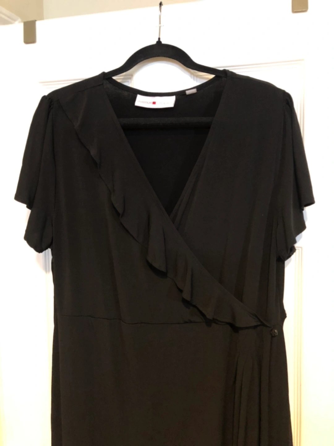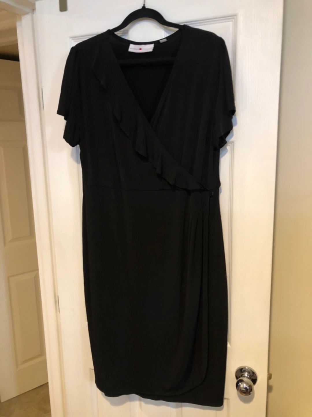 This black wrap dress is so versatile! It has been well worn over the years, and still has so much love to give! With the wrap front, short sleeves, and v-neck, it can be dressed up or down and go from a wedding to a funeral (done it!). Size 18/20. Open to trades as well!