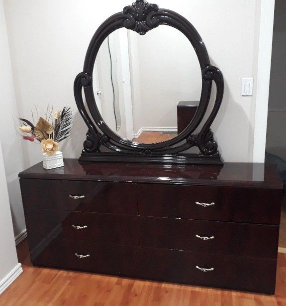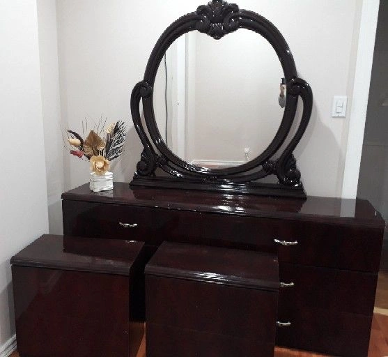 Selling a beautiful dark wood dresser with an oval mirror. This set comes with a dresser and two matching side tables. Perfect for adding a touch of sophistication to your bedroom!