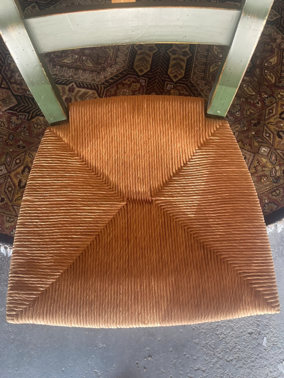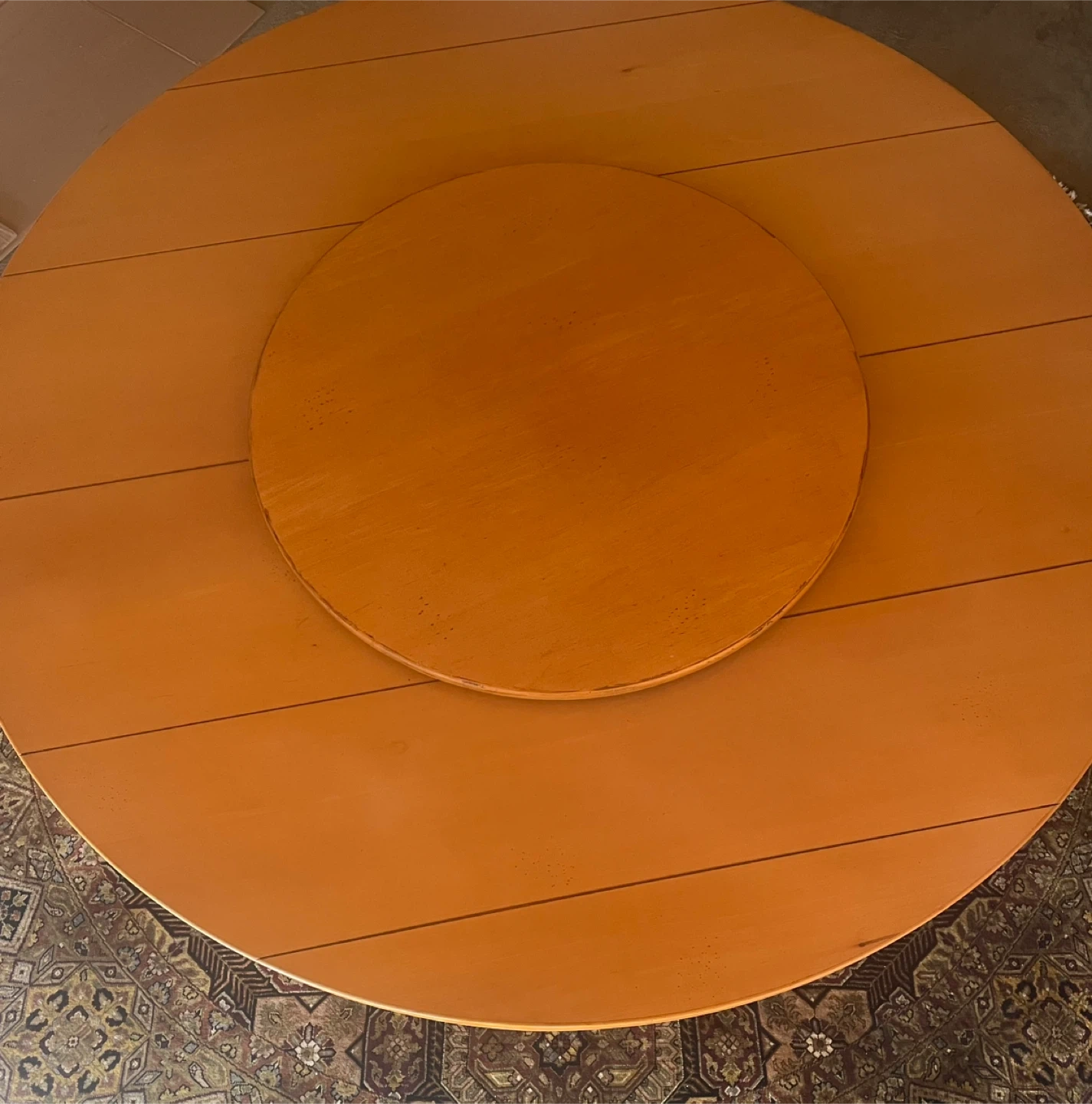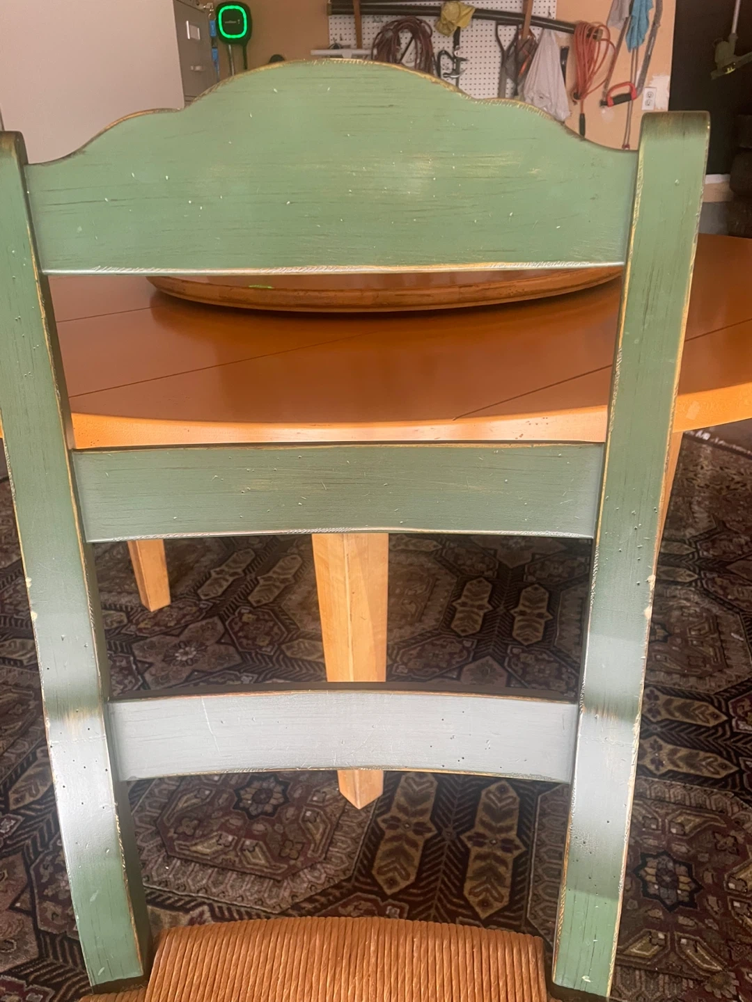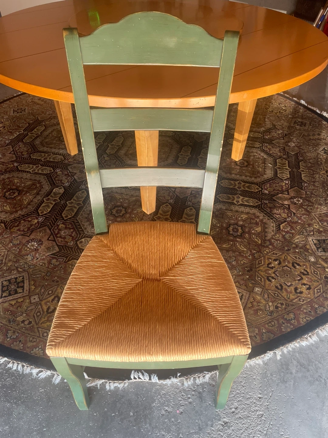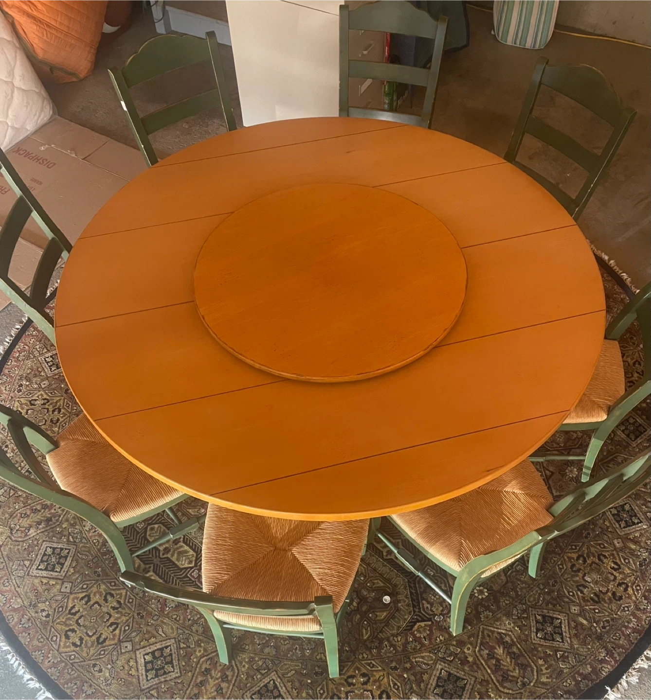 This set includes: A 68” maple dining table. Note: This table is a light maple, it has faded a little other than where the Lazy Susan sits. Not noticeable with the Lazy Susan as you can see in the pictures A maple Lazy Susan for the table. Set of 8 DREXEL HERITAGE Cottage Style Dining Chairs Green with Rush Seats The hand knotted 10’ in the pictures is also for sale in a separate post. Can be seen in Chestermere.