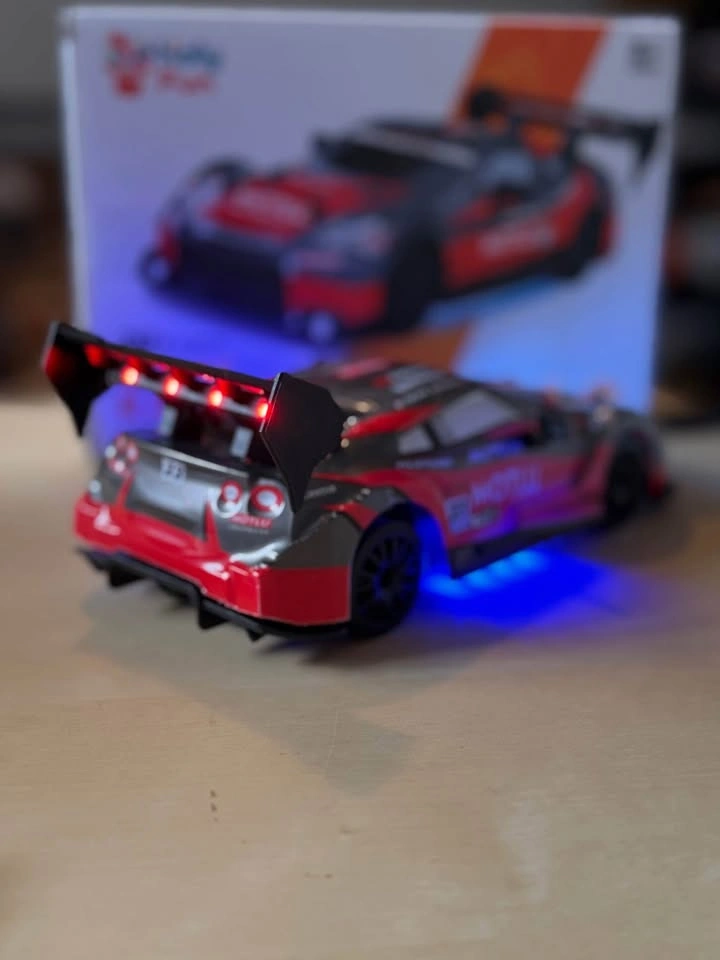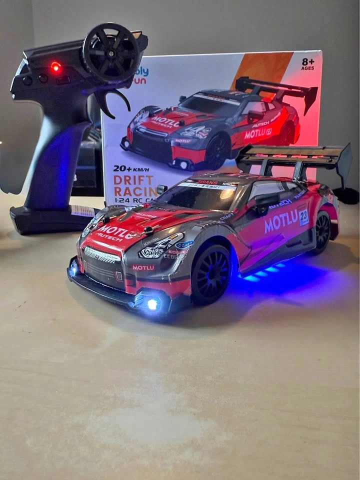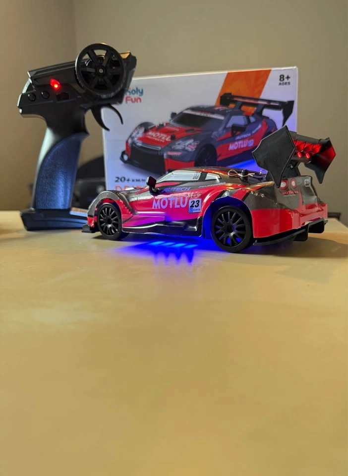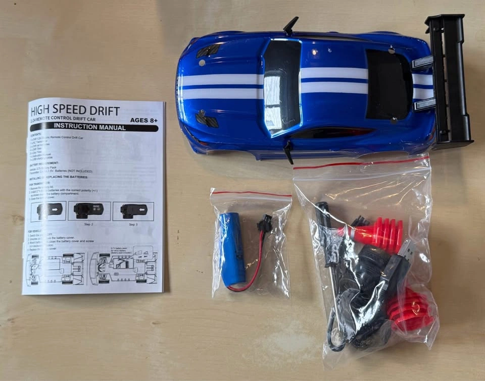 Used for less than a minute, has 2 wheels set one for drifting and one for driving it like normal. Along with extra like pylon for practicing those drifting corners. Along with 2 shells to make the car look clean.