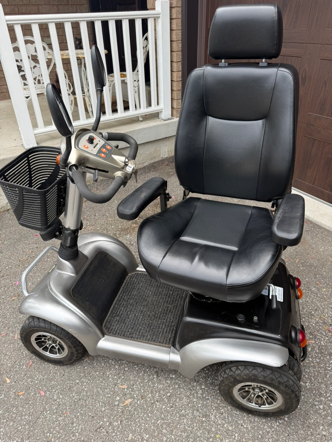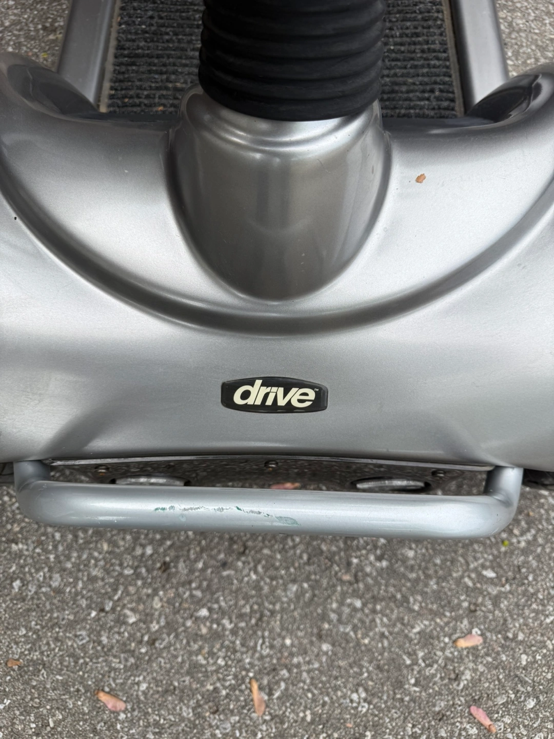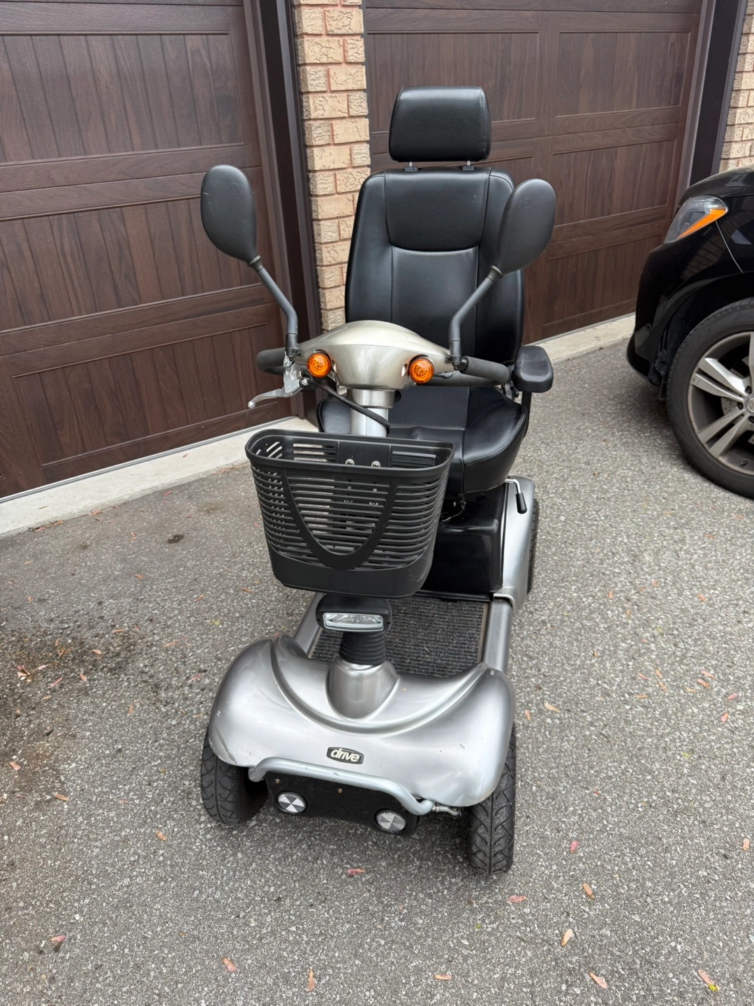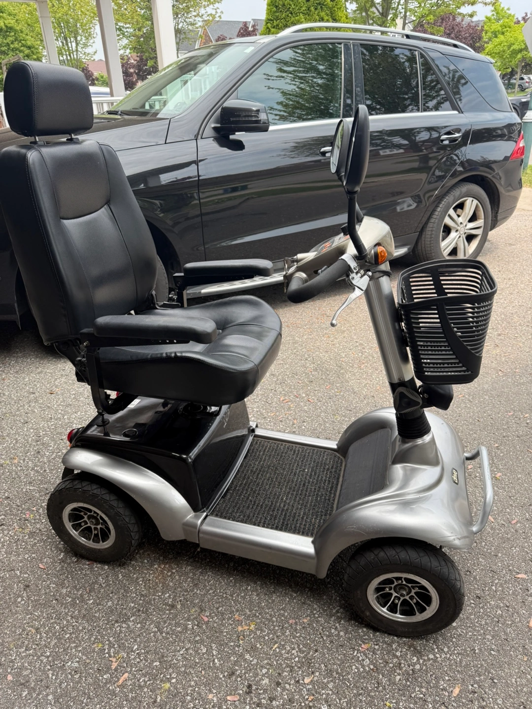 Drive Prowler 4 wheel mobility scooter. All new parts and brand new two batteries (paid $800). A mobility scooter. Features include a black seat with armrests, a basket in the front, and a control panel on the steering column. This can make a great companion for enjoying the outdoors at your own pace. This scooter is one of the higher end model and it is sold $4000+tax in stores. My dad used it 3 times and it is two big for turns in his apartment. It is in mint condition and everything new and works.