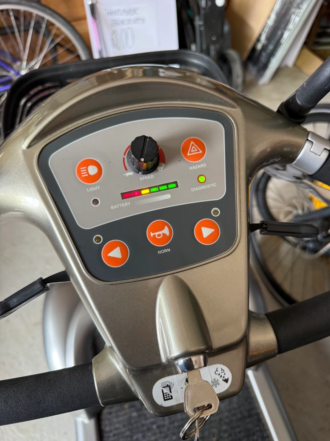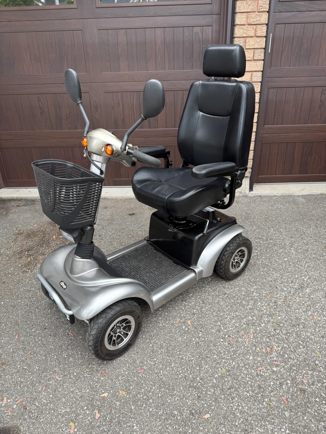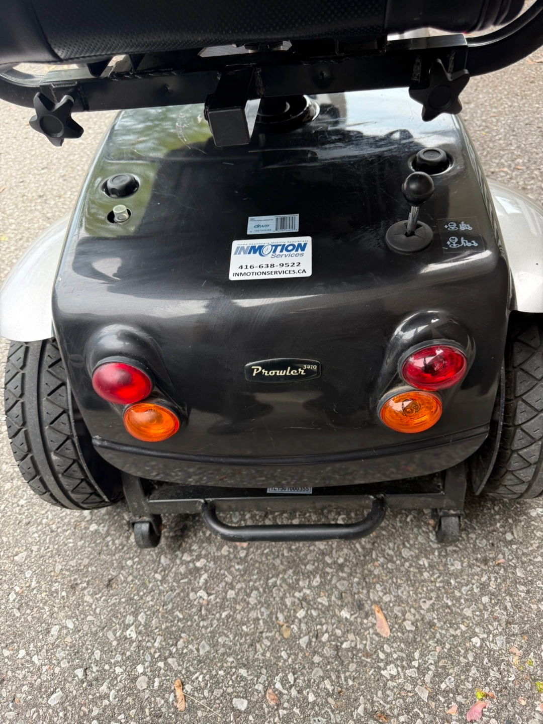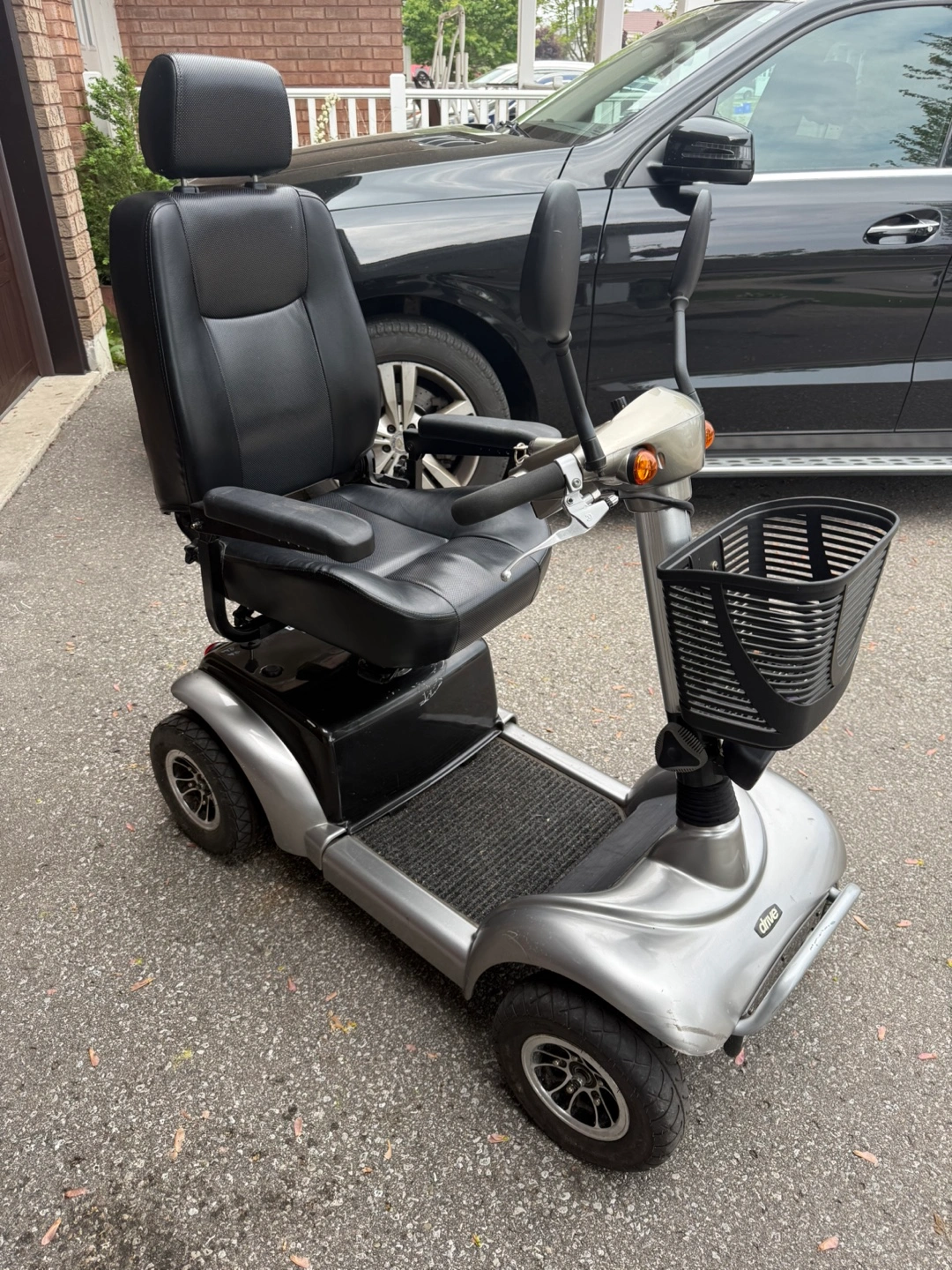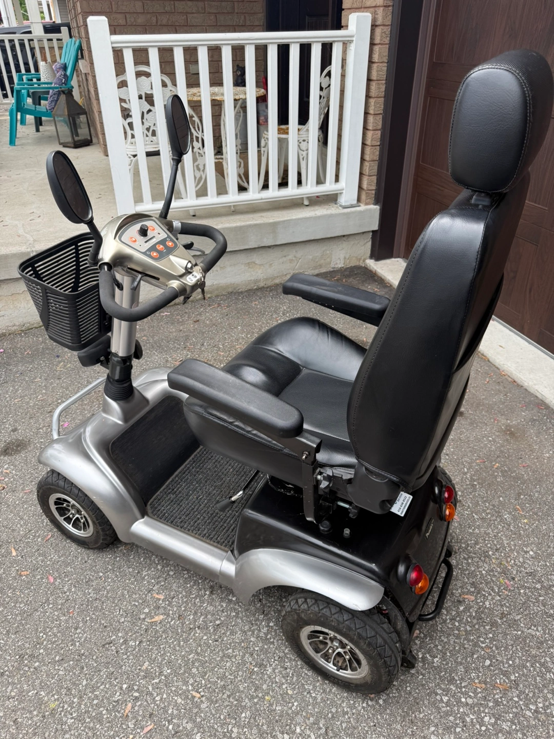 Drive Prowler 4 wheel mobility scooter. All new parts and brand new two batteries (paid $800). A mobility scooter. Features include a black seat with armrests, a basket in the front, and a control panel on the steering column. This can make a great companion for enjoying the outdoors at your own pace. This scooter is one of the higher end model and it is sold $4000+tax in stores. My dad used it 3 times and it is two big for turns in his apartment. It is in mint condition and everything new and works.
