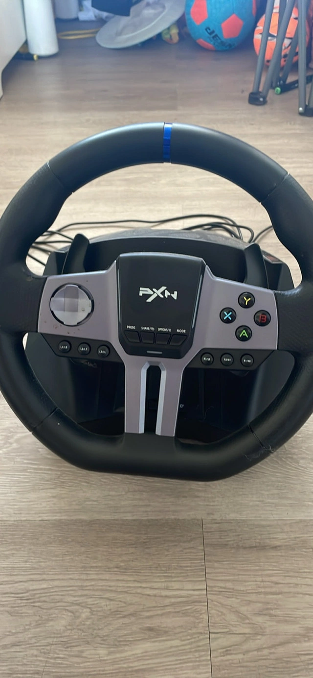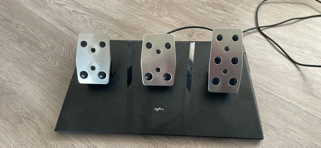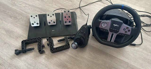 New, never used but out of box. $350 instead of $450, and comes with pedals, wheel, shifter, and two standing plates. It works on PS 4/5, PC, and Xbox.