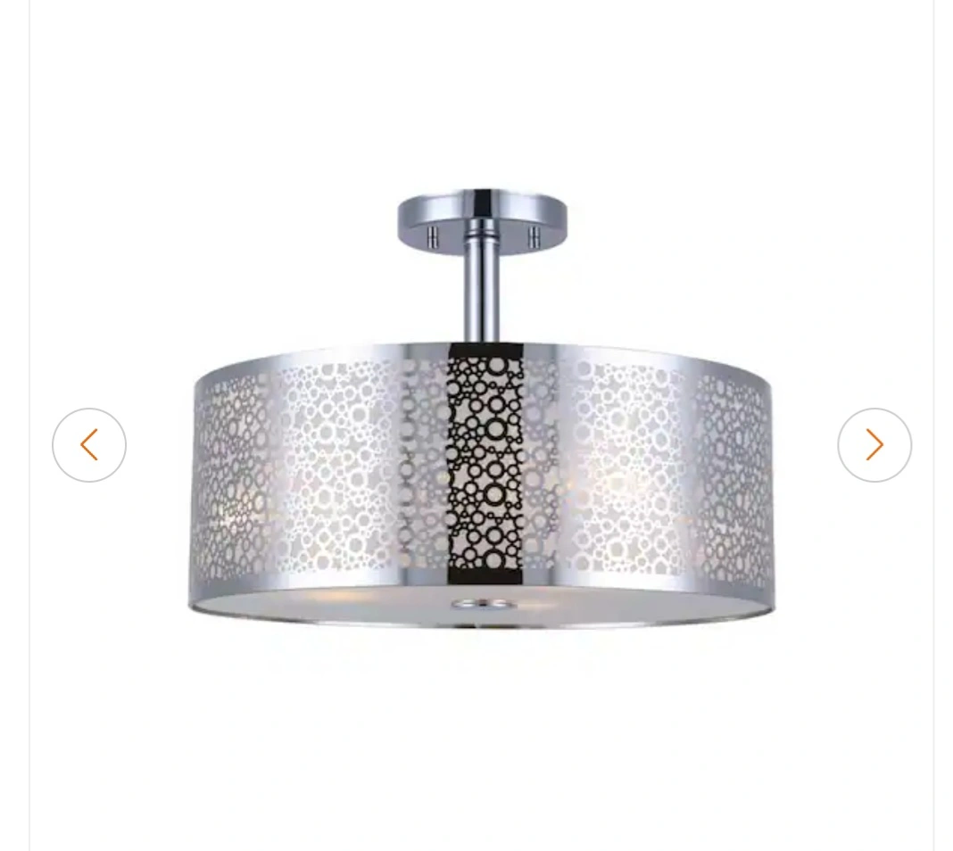 This is a drum-shaped ceiling light fixture. It features a patterned shade and at the bottom to provide soft, ambient lighting. It's in great condition and ready to brighten up your space! Diameter 15.5 Homedepot Canarm