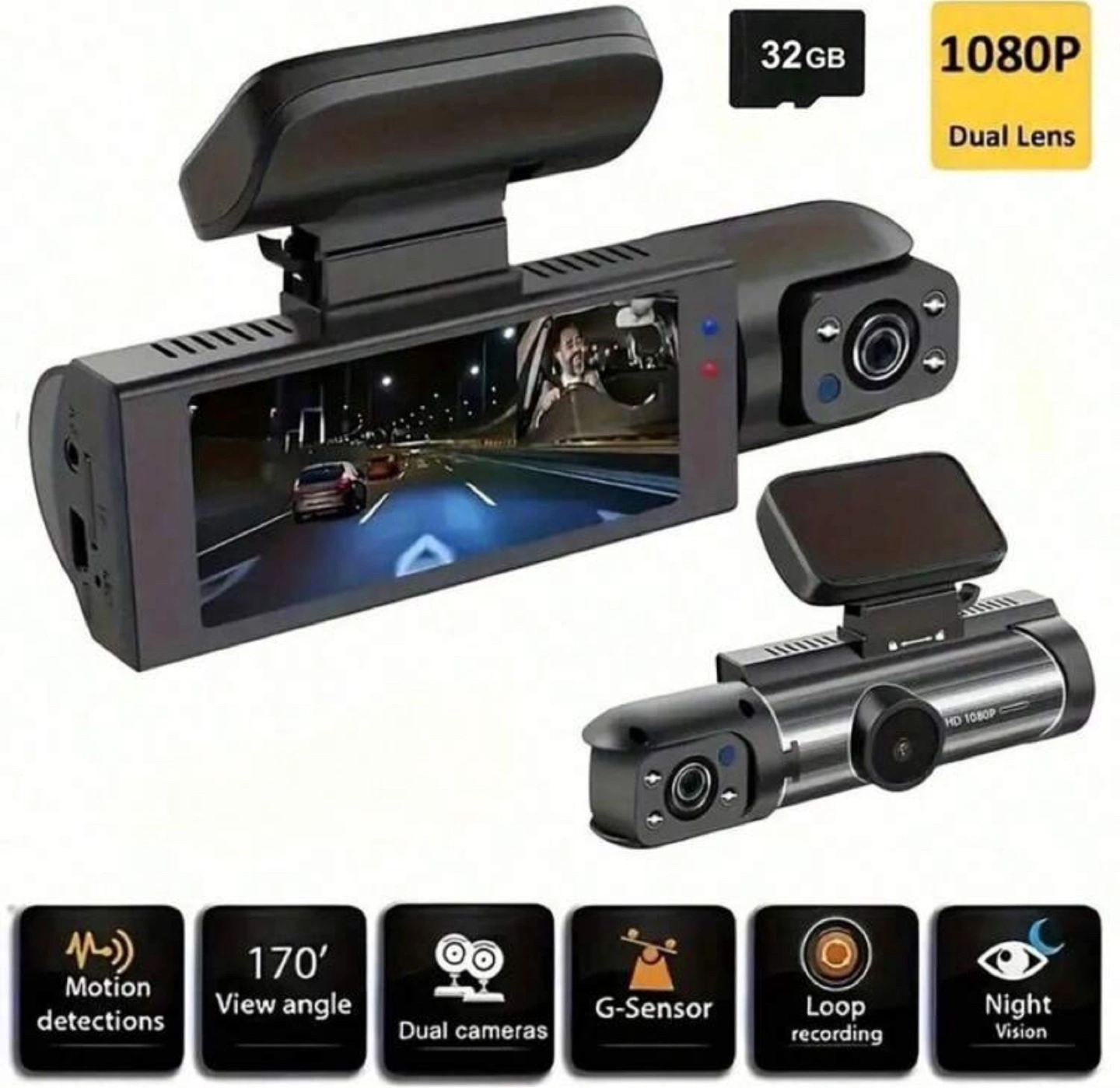 Only pre-orders All our products are brand New Free home delivery / pickup available within 10-14 days (Ladner) Standard delivery may apply if it’s away from Ladner city Pay less & buy more 32GB dual lens dash cam. Records 1080P video. Features 170° front and 140° cabin viewing angles. Includes night vision, G-sensor, loop recording, and motion detection. Parking monitor function requires a hardwire kit. Great for added vehicle security.