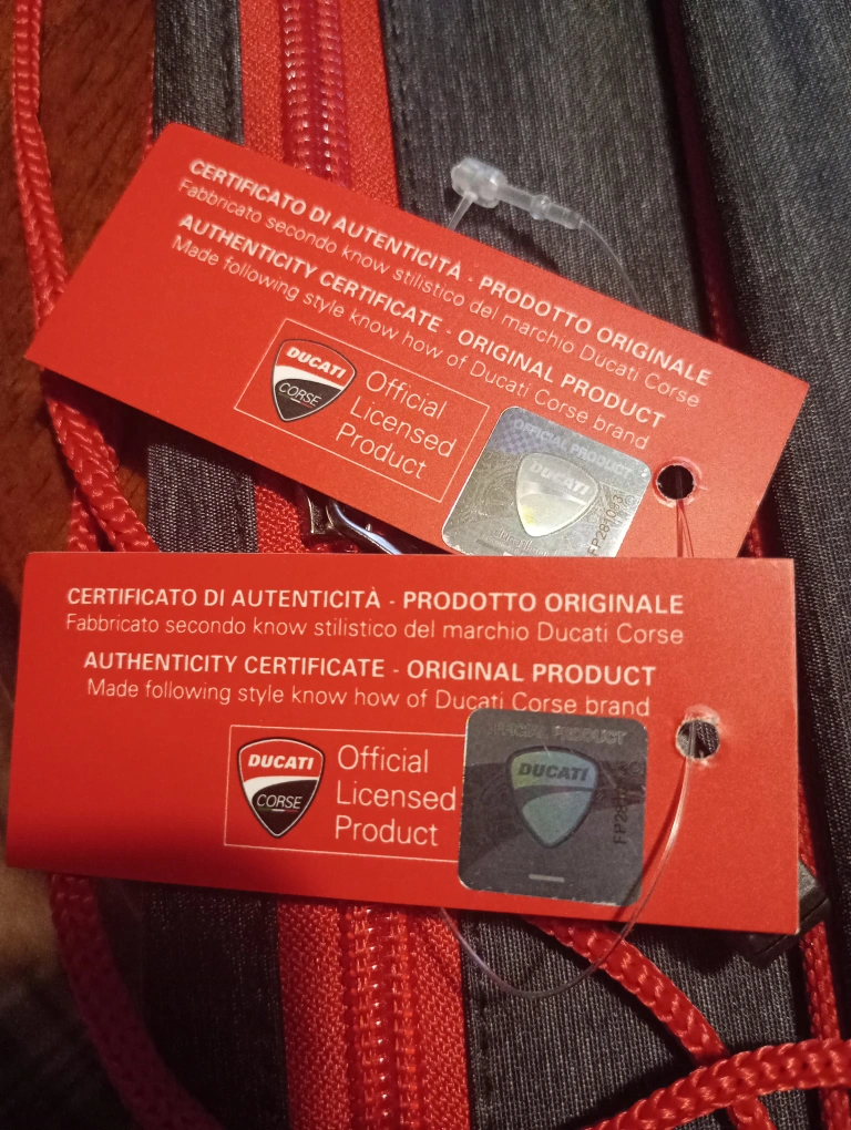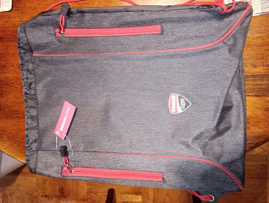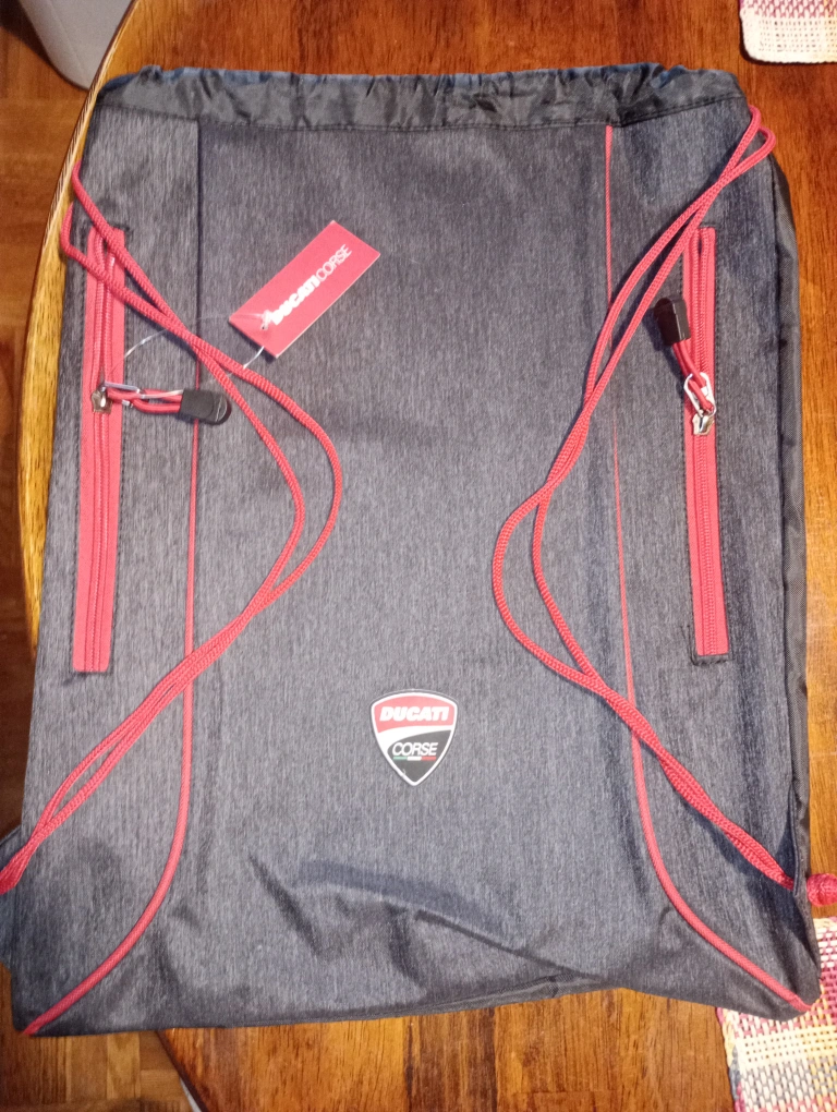 Ducati Light Sac backpack . Brand New. Never Used. For going to the beach, gym, school, Canada day. Hangs from the shoulders, arms, hands, zippered on the sides, closes with a rope on the top. Water resistant. Authenticity certified.