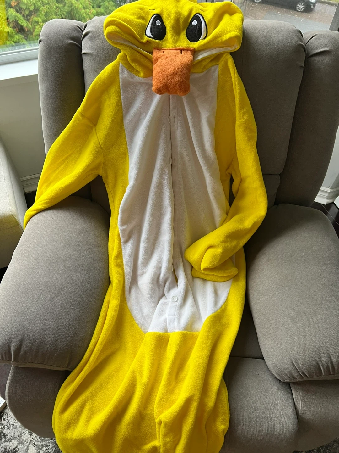 Selling a cute duck onesie! It's a size large and features a hood and a tail. Perfect for lounging around the house or a fun costume