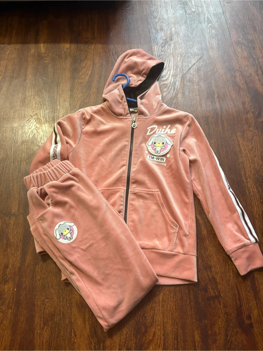 Selling a cute Duihe velour tracksuit for kids! It's a soft, plush material in a lovely peach colour. The set includes a zip-up hoodie and matching pants. There's a fun cartoon character on both the hoodie and the pants. Perfect for keeping your little one comfy and stylish!