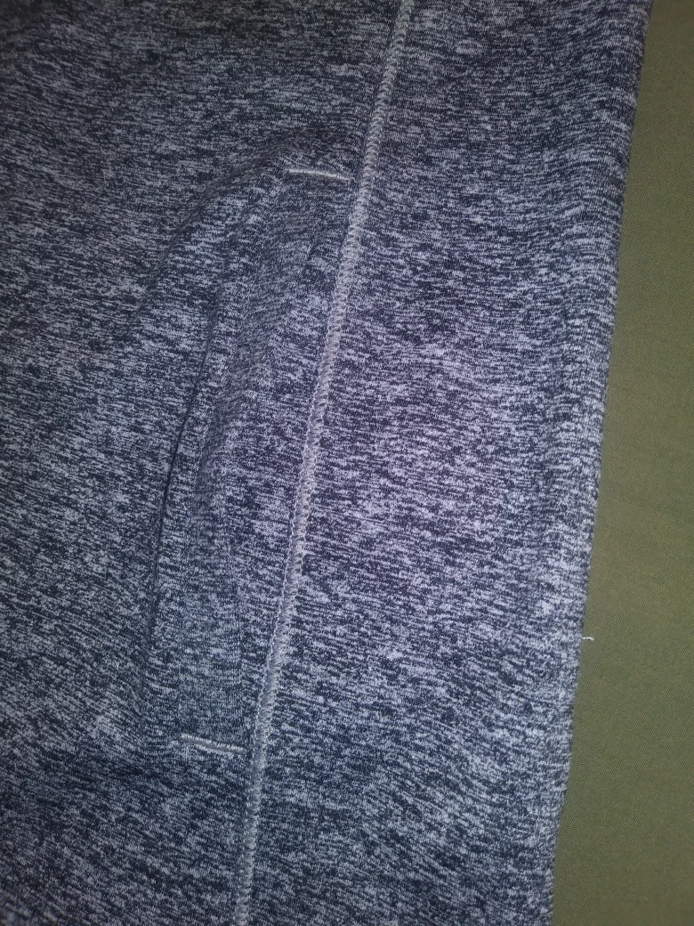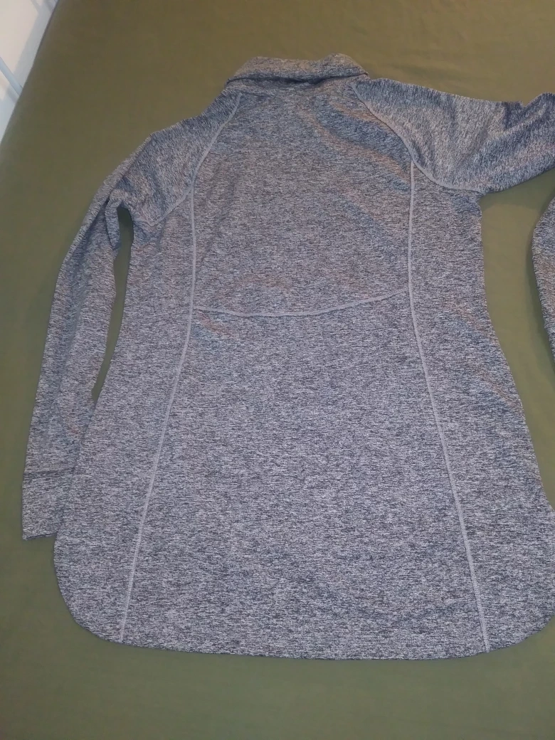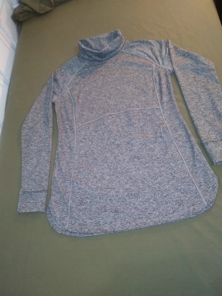 Grey heather long sleeve mock neck shirt. Size medium. Fabric is soft and stretchy. Features a curved hem and thumbholes. Machine washable. Kangaroo pockets
