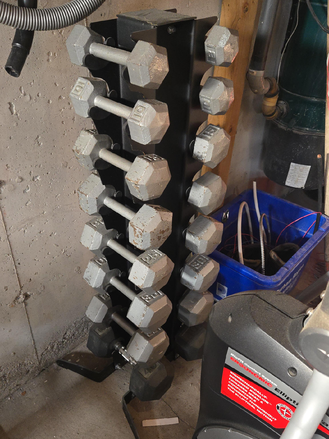 Selling a set of dumbbells with a rack. The dumbbells are various weights, perfect for a home gym setup!