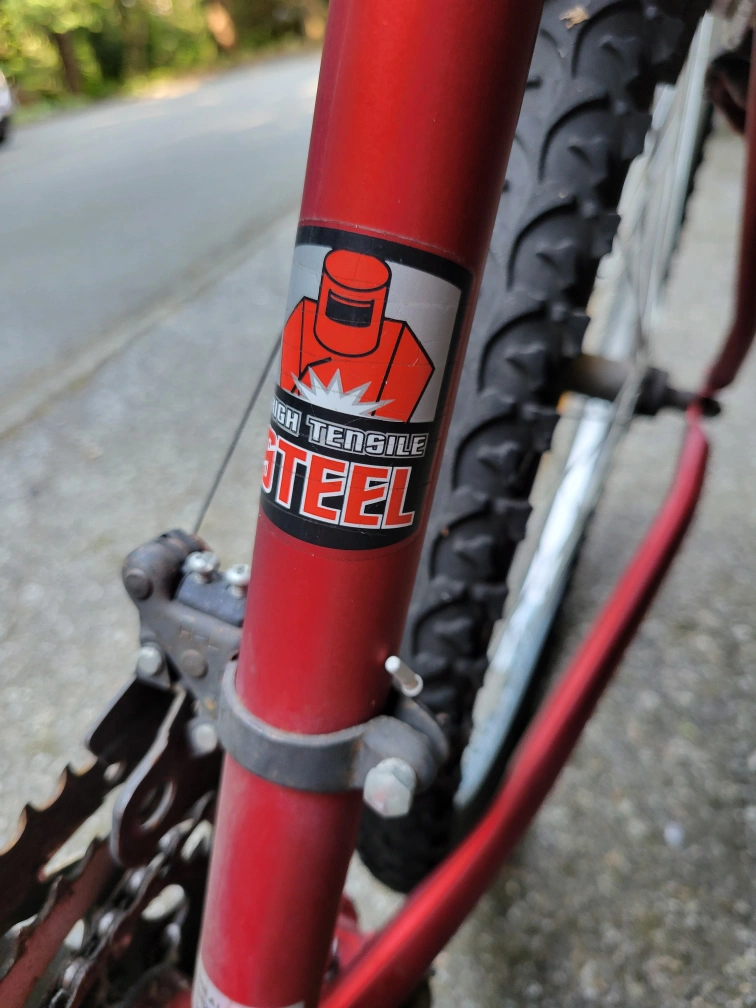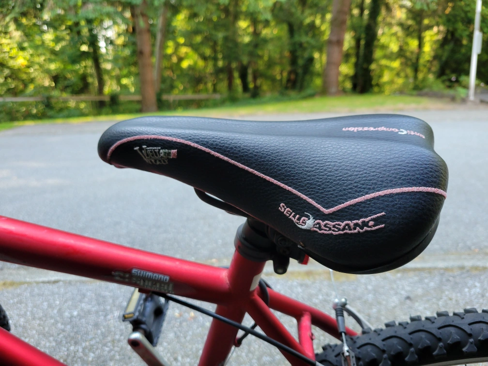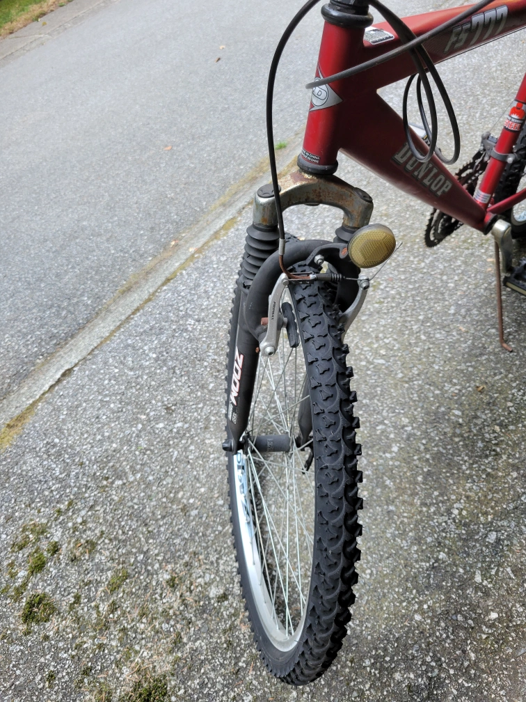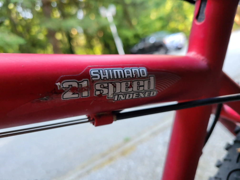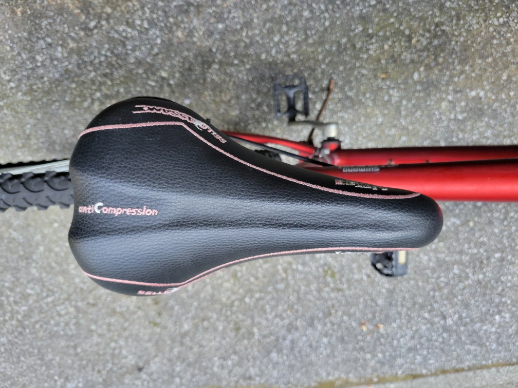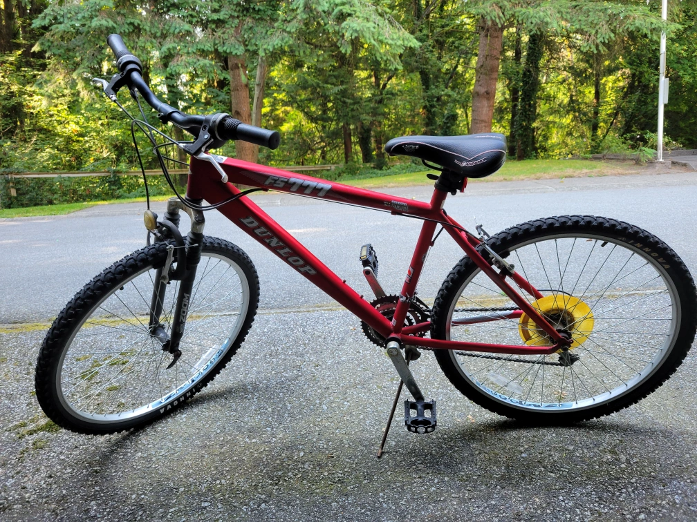 Selling a red Dunlop FS777 mountain bike. It has a Selle Assano seat and Shimano 21 speed indexed gears. The tires are Innova. This bike is ready for some off-road adventures!