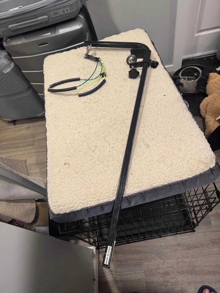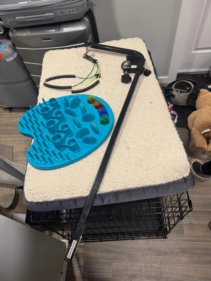 Dog crate with double door, designed with your pet's safety, security, and comfort in mind. 36-inch indoor dog crate made of durable metal wire; divider, sturdy base tray and top handle included. Reliable manual locking mechanisms for safe and secure containment. Folds flat for easy portability and compact storage; removable plastic base tray for easy cleaning. Product dimensions: 36 x 23 x 25 inches (LxWxH). Metal hook at the bottom of the crate to prevent plastic tray from moving out. Please lock the hook well after installing the tray everytime in daily use. Bed Orthopedic Support: The dog bed large is made of egg crate foam, correcting your pet’s posture and alleviating pressure on joints and bones. It is also beneficial for older pets, providing them with a painless sleep. Designed for Pets: The pet beds dogs large provides plenty of room for your pet friend to stretch out and get comfortable in any position. The portable mattress is great for indoor and outdoor use, dog crates, cars or anywhere. All-Season: The two-sided design features a warm sherpa with a cooling oxford fabric for all-season use and is easy to carry outside, in a crate, and car. Keeping your dog cool in summer and warm in winter for increased comfort. Easy to Clean: Featuring an easy-to-remove cover that makes deep cleaning a breeze, just toss it in the wash in cold water and tumble dry low. Do not use bleach, iron or fabric softener. Bonus Dog Puzzle Dog grooming table arm