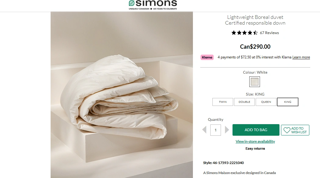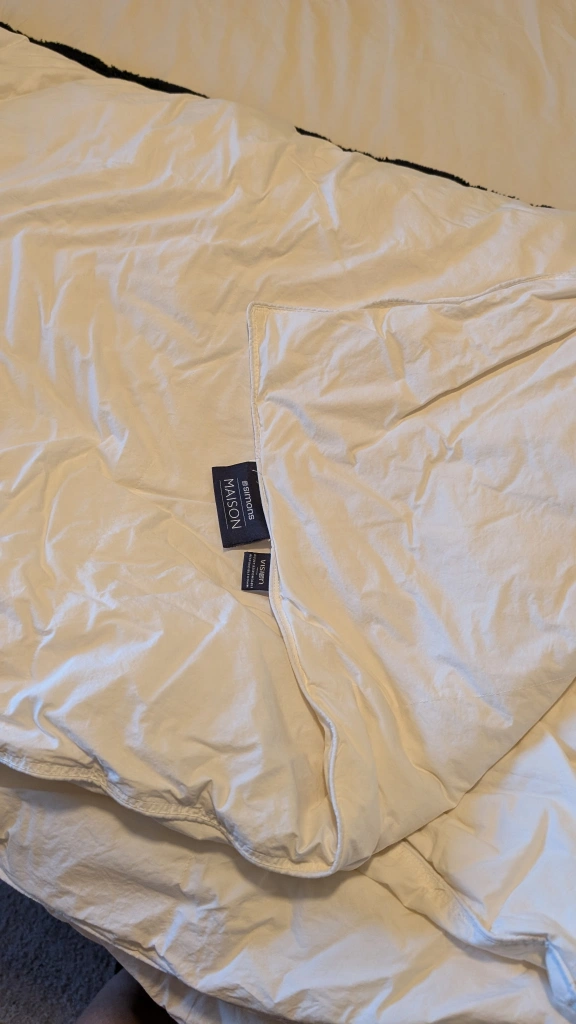 Selling a King size Simons Maison Lightweight Boreal duvet. It's white and in great condition. The original listing shows it retails for $290. It's a Simons Maison exclusive designed in Canada