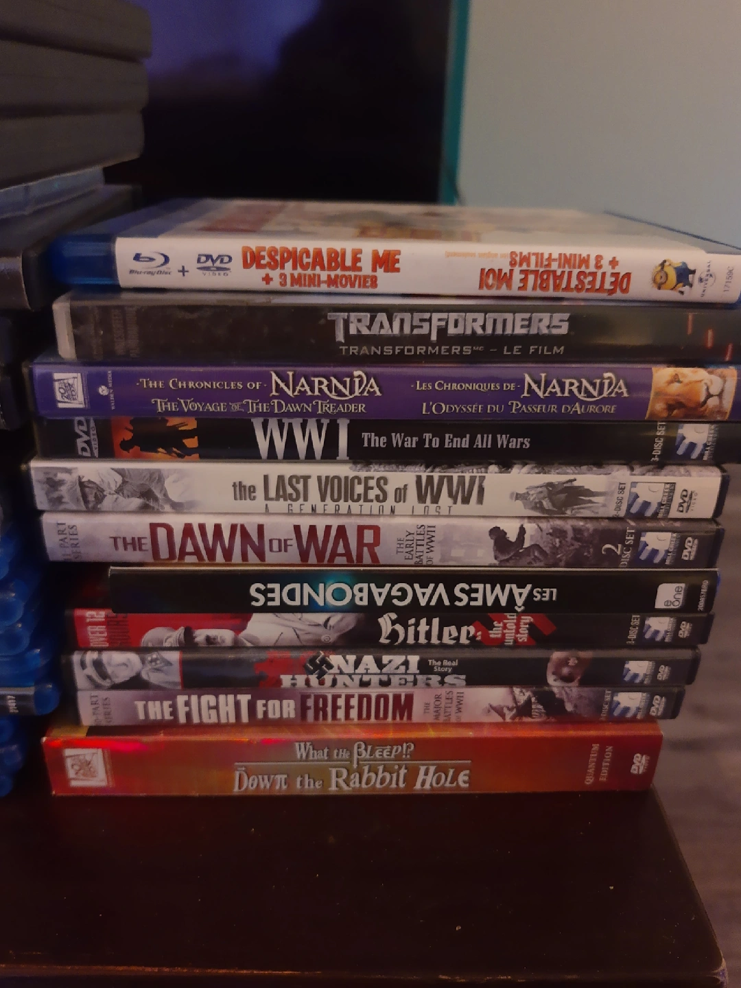 Selling a collection of DVDs and Blu-ray movies. Titles include Despicable Me, Transformers, Chronicles of Narnia, WWII The War to End All Wars, Dawn of War, and more! Great for movie nights or expanding your collection 2-3 dollars each if you want to buy singles or mix and match :)
