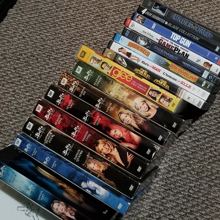 Giving a collection of DVDs including: - Buffy the Vampire Slayer (Seasons 1-7) - Top Gun - Underworld - Glee (Season 1) - Tomb Raider - Hoodwinked - The Game Plan - Blade Collection - She's the Man and more!