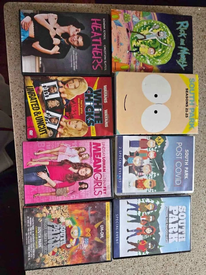 $10 Each Includes: • Rick and Morty Season 1 • South Park Season 26 • White Chicks • Mean Girls • Heathers • South Park: Bigger, Longer & Uncut • South Park: Into the Panderverse • South Park: Post Covid • Bee Movie • Captain Underpants • Cloudy with a Chance of Meatballs • Over the Hedge