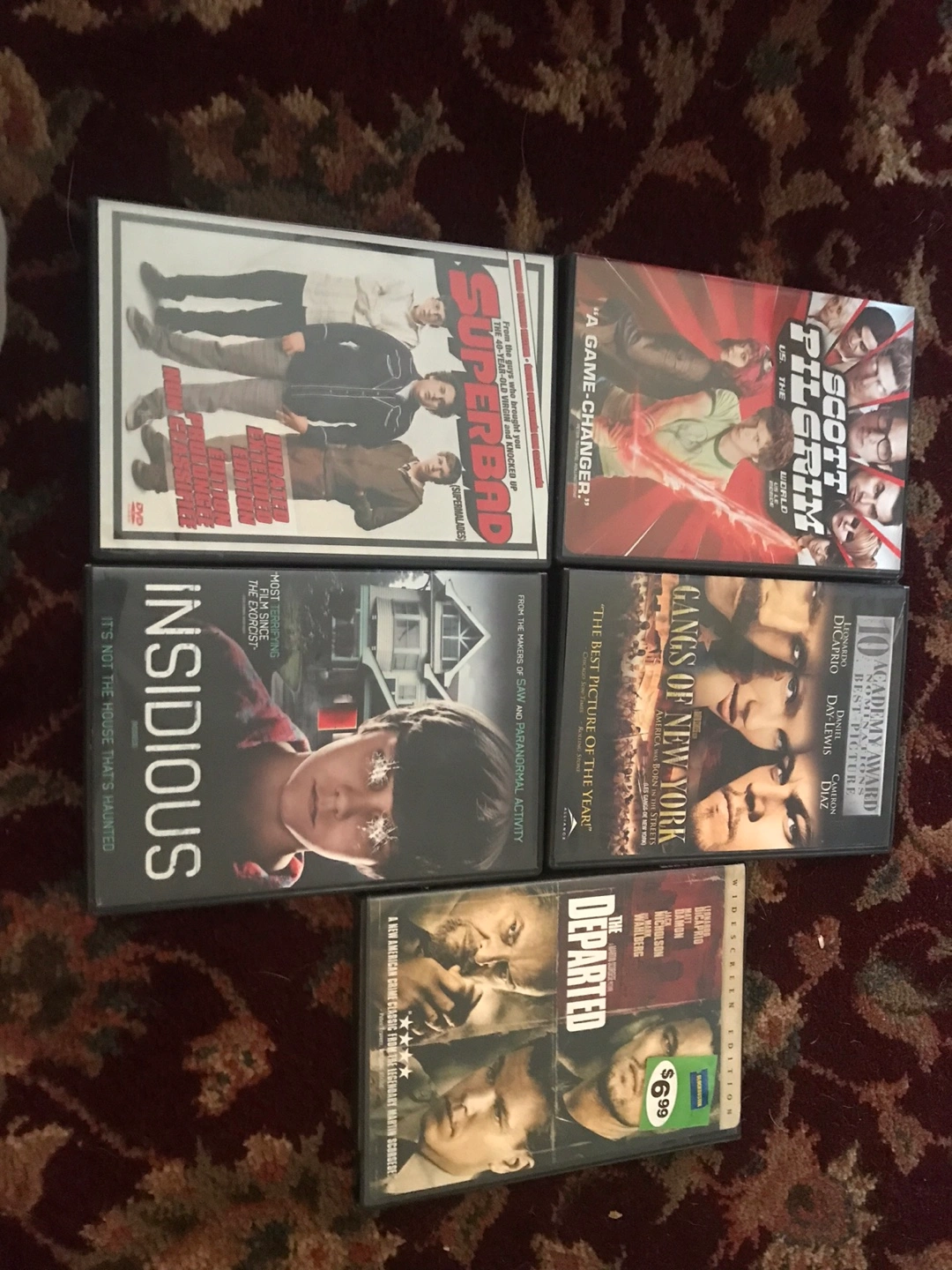 3$ each. Selling a collection of DVDs! Includes: - Superbad - Scott Pilgrim vs. the World - Insidious - Gangs of New York - The Departed All in good condition and ready for your next movie night