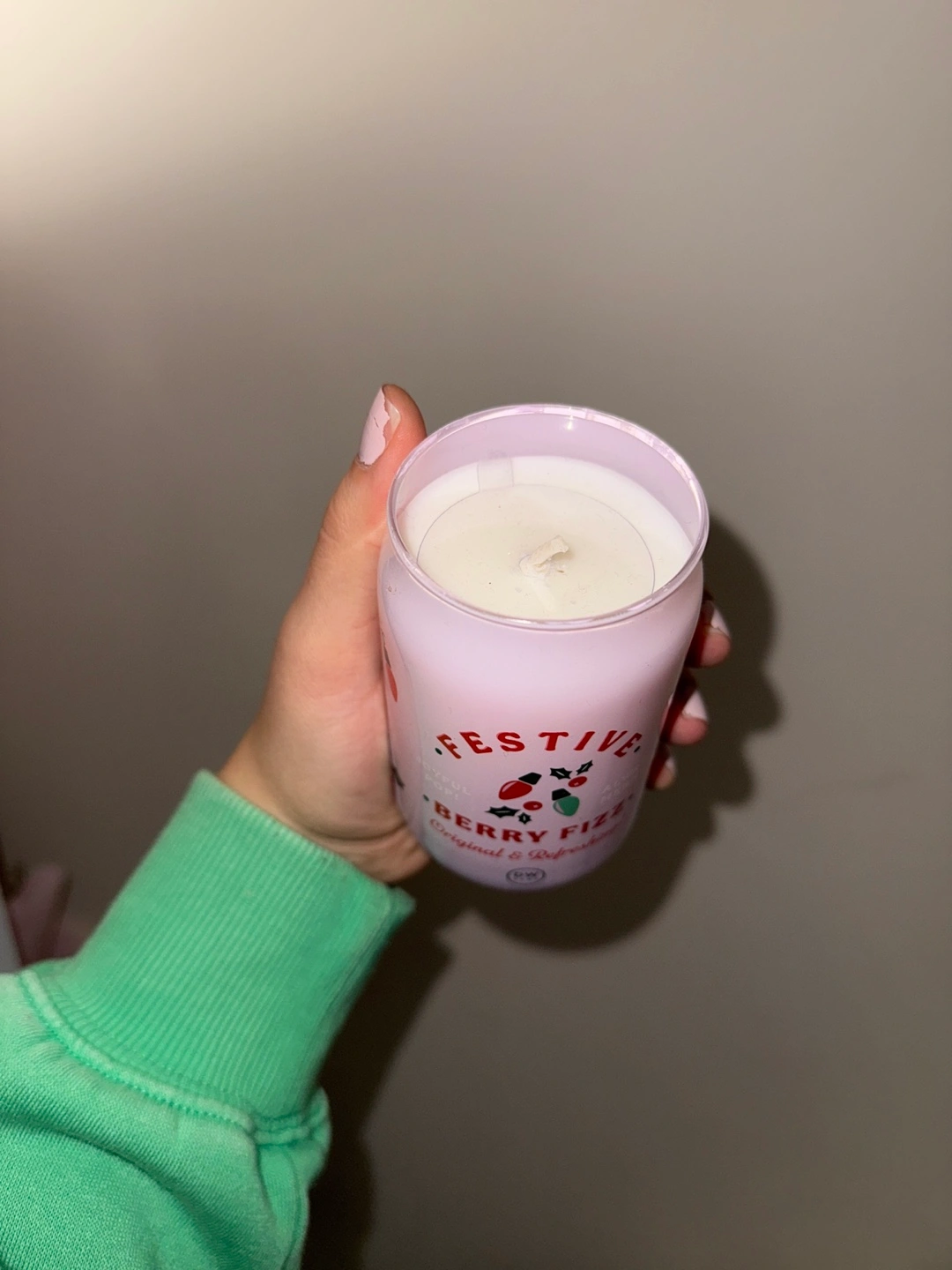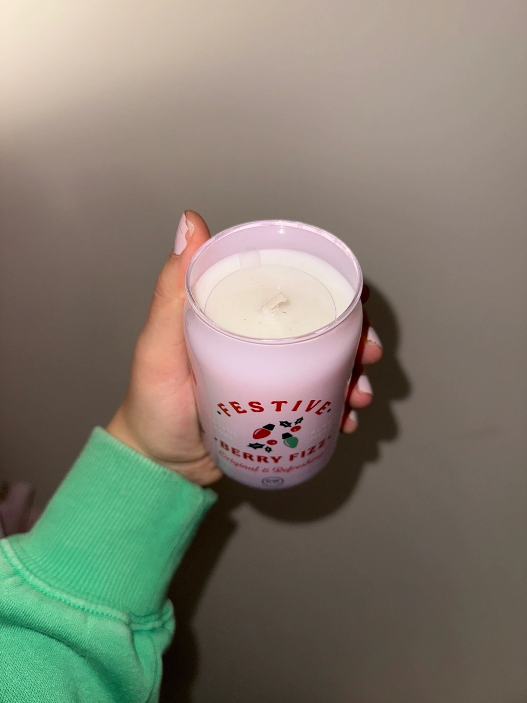 Pink can-shaped candle with a berry scent. Smells amazing and it’s brand new.