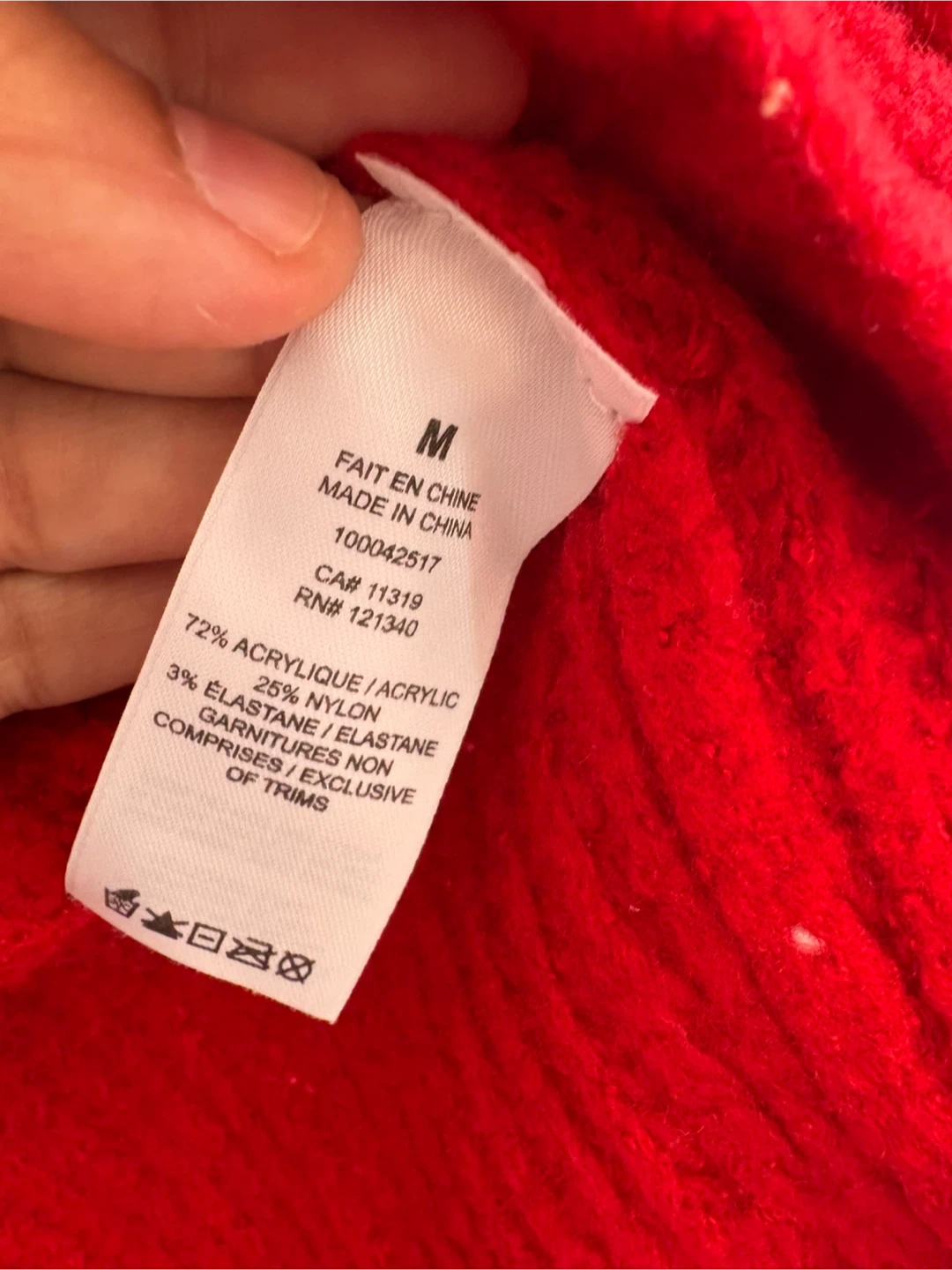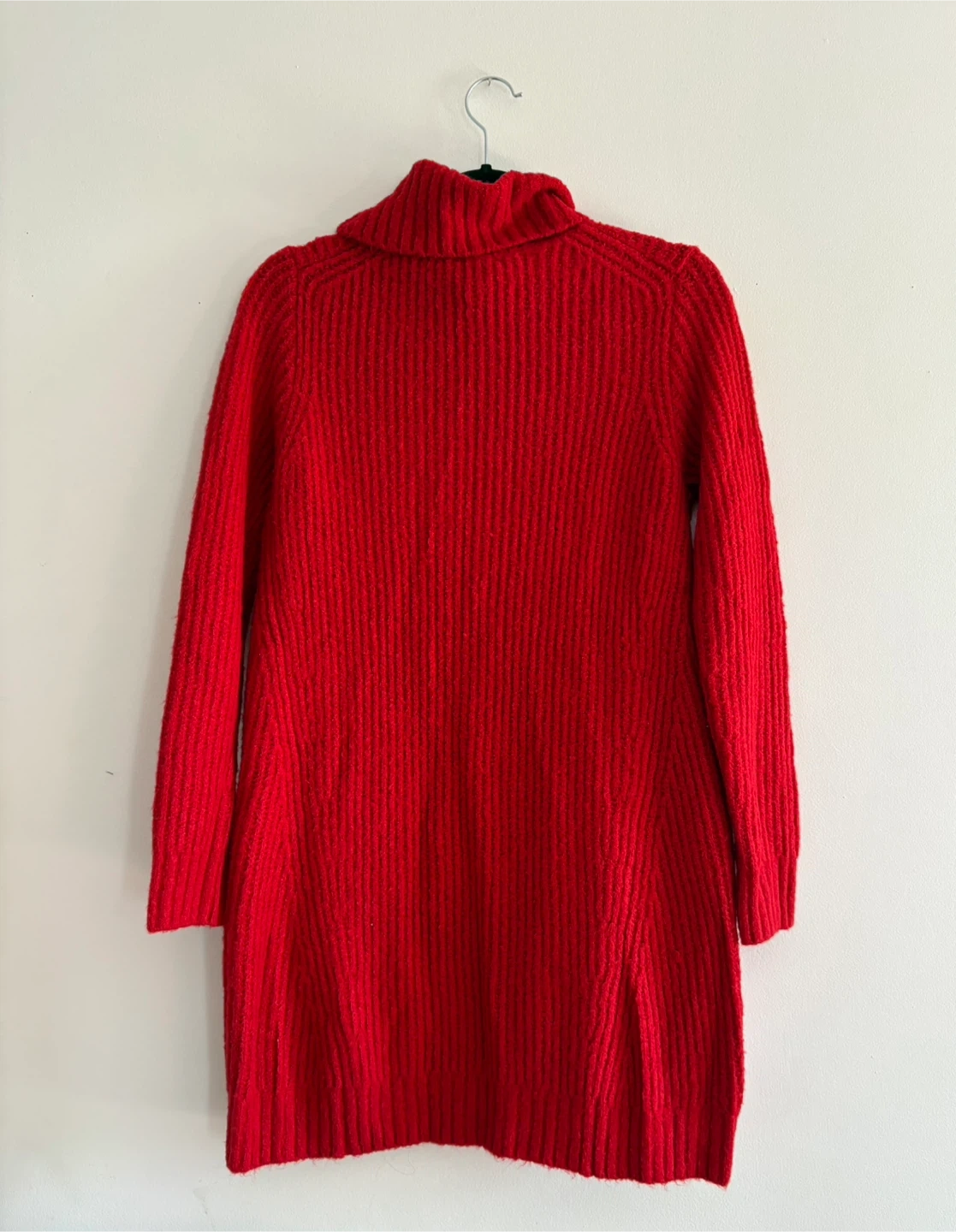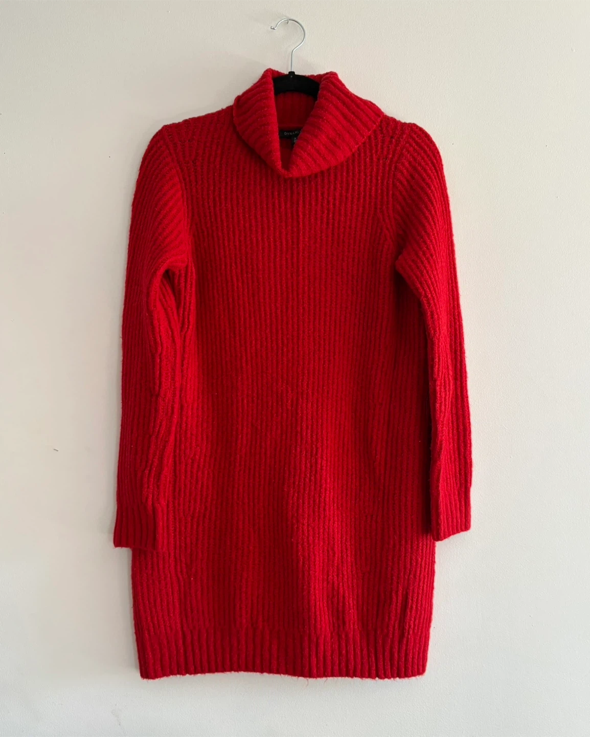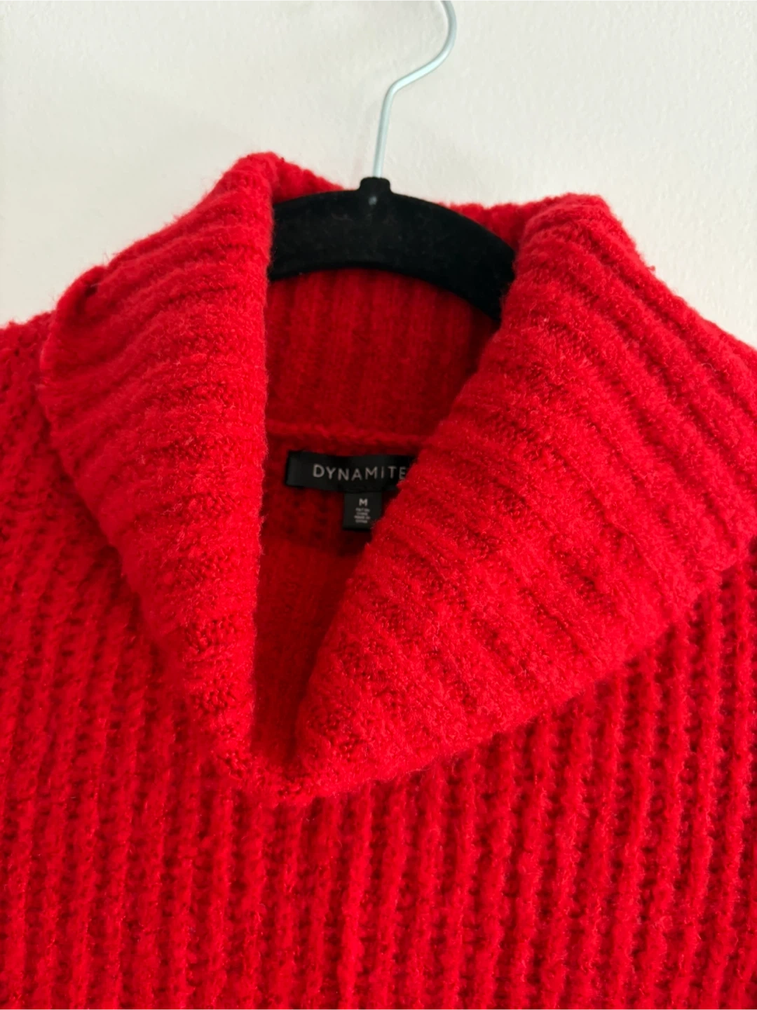 Cozy up in this vibrant red knit turtleneck dress from Dynamite! It's a size medium and made with a blend of 72% acrylic, 25% nylon, and 3% elastane for a comfortable fit. Perfect for staying warm and stylish this season Colour is more like tomato red Great condition Price is firm Cash only Pick up please