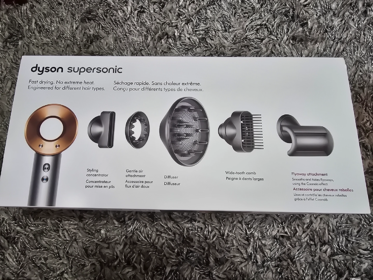 Selling a Dyson Supersonic hair dryer. It offers fast drying with no extreme heat, engineered for different hair types. It comes with various attachments including a styling concentrator, gentle air attachment, diffuser, wide-tooth comb, and flyaway attachment. Perfect for achieving smooth and stylish hair!