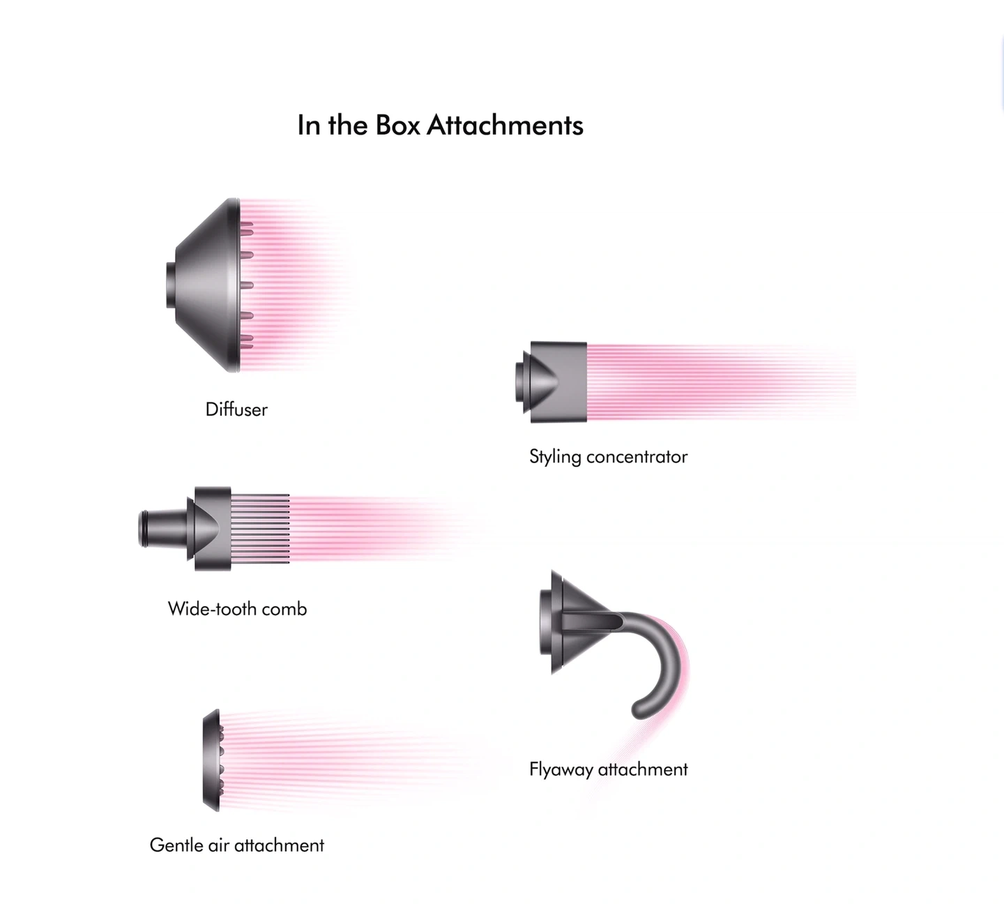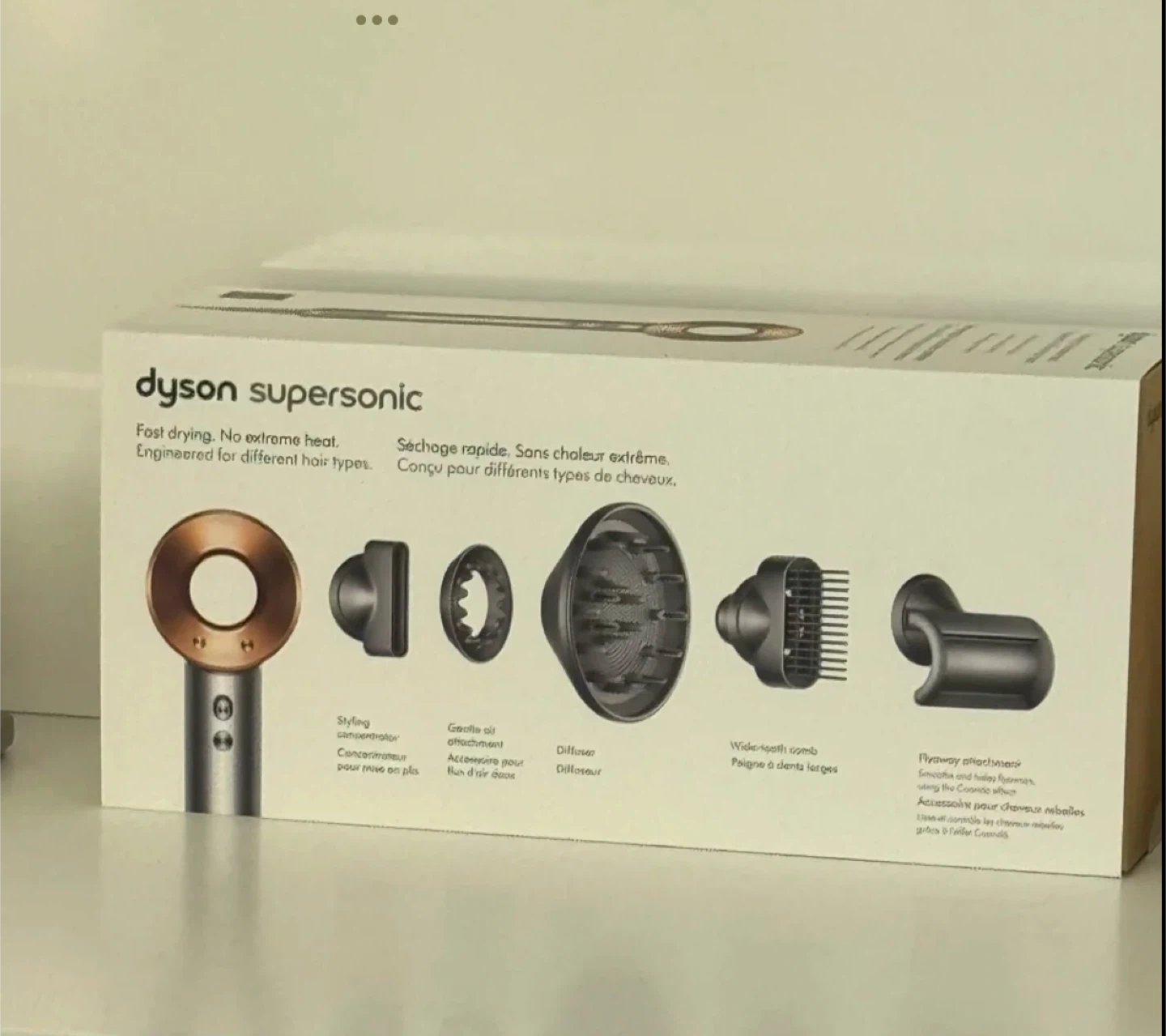 Brand new box of Dyson Supersonic hair dryer. It comes with all the attachments in the box! The Dyson Supersonic offers fast drying with no extreme heat and is engineered for different hair types. Attachments included are: Styling concentrator, Gentle air attachment, Wide-tooth comb, Diffuser, and Flyaway attachment