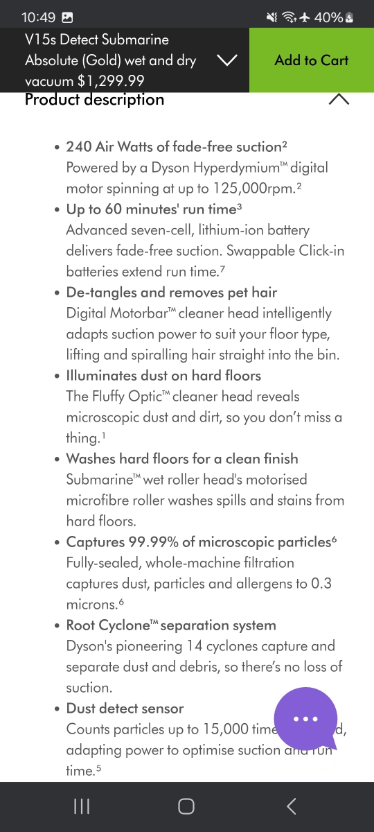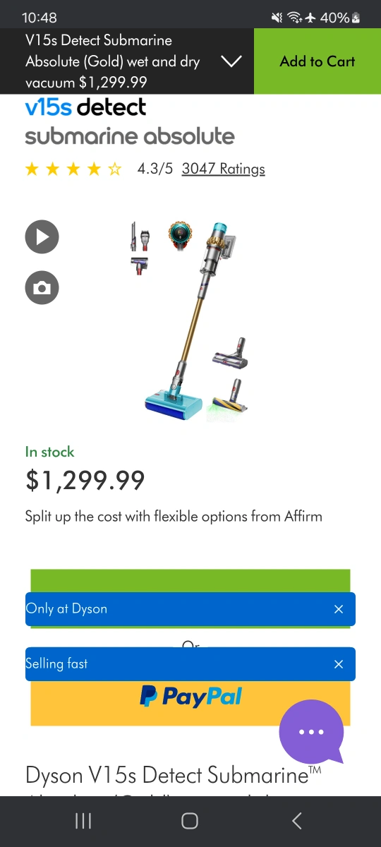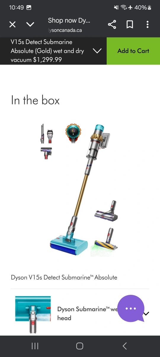 Looking to sell a Dyson V15s Detect Submarine Absolute vacuum cleaner. It's designed to wash hard floors for a clean finish with its Submarine wet roller head. The Fluffy Optic cleaner head reveals microscopic dust, so you don't miss a thing! It also features a Digital Motorbar cleaner head that intelligently adapts suction power. Captures 99.99% of microscopic particles and allergens. Originally priced at $1,299.99